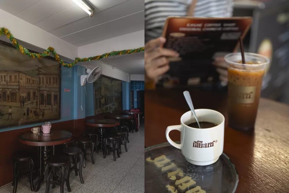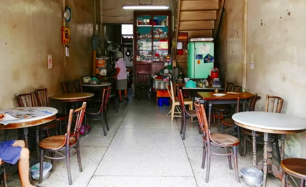 店內的裝潢、設備(垃圾桶是古老吐痰罐),甚至賣的飲食都依然不變,簡單的泰式咖啡、茶飲、水煮蛋+吐司,就標示在古舊的冰箱上,而且很便宜的銅板價。