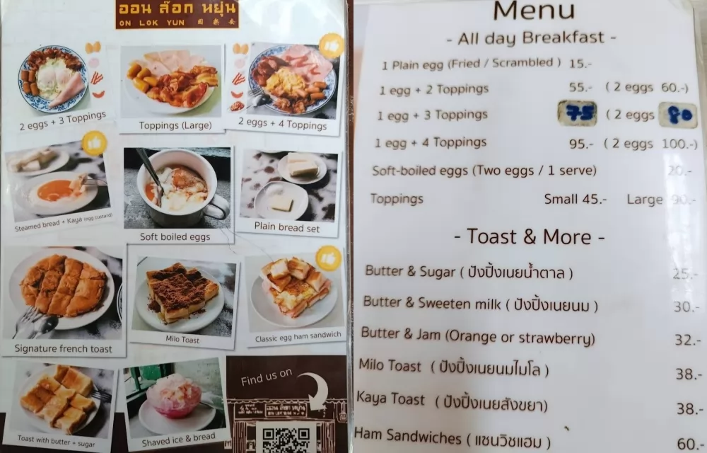 早餐最出名的是招牌菜Kai Kra Ta(ไข่กระทะ),由越南傳進來的早餐,是用平底鍋煎蛋,肉碎,煙肉,再配上香腸多士,早年很時麾的吃法!