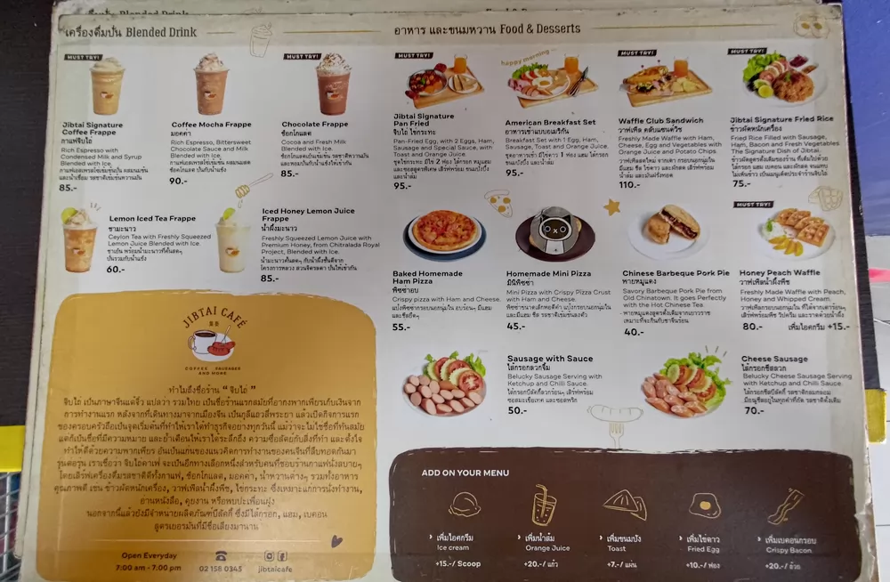 店內的咖啡很有名,味道與邢泰記的咖啡不相伯仲。此外,泰國風格的美式早餐也很受歡迎,還有起司、麵包、水煮蛋(ไข่ลวก約15銖)、冰淇淋等等的餐點。來這裡吃早餐就不能錯過。