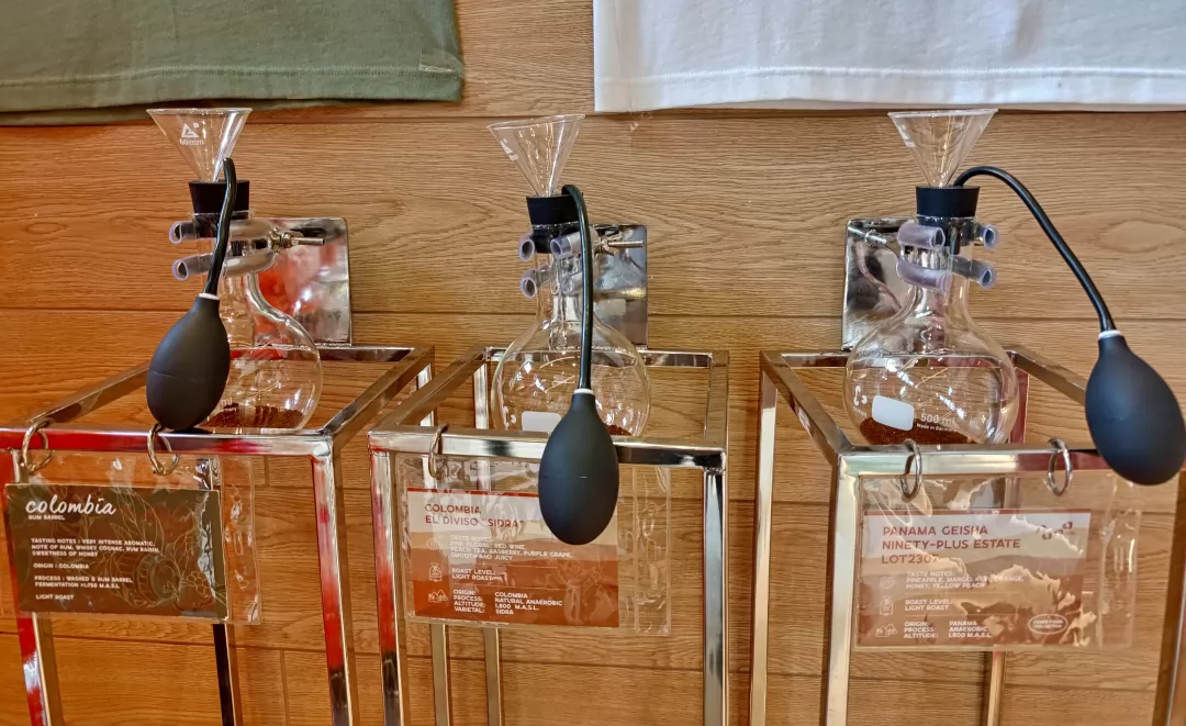 同時精選來自多個國家的優質精品咖啡,而且沖好的咖啡會放在木製托盤上,後方插上一張說明卡,註明咖啡豆的來源和相關資訊,掛品質的保證。