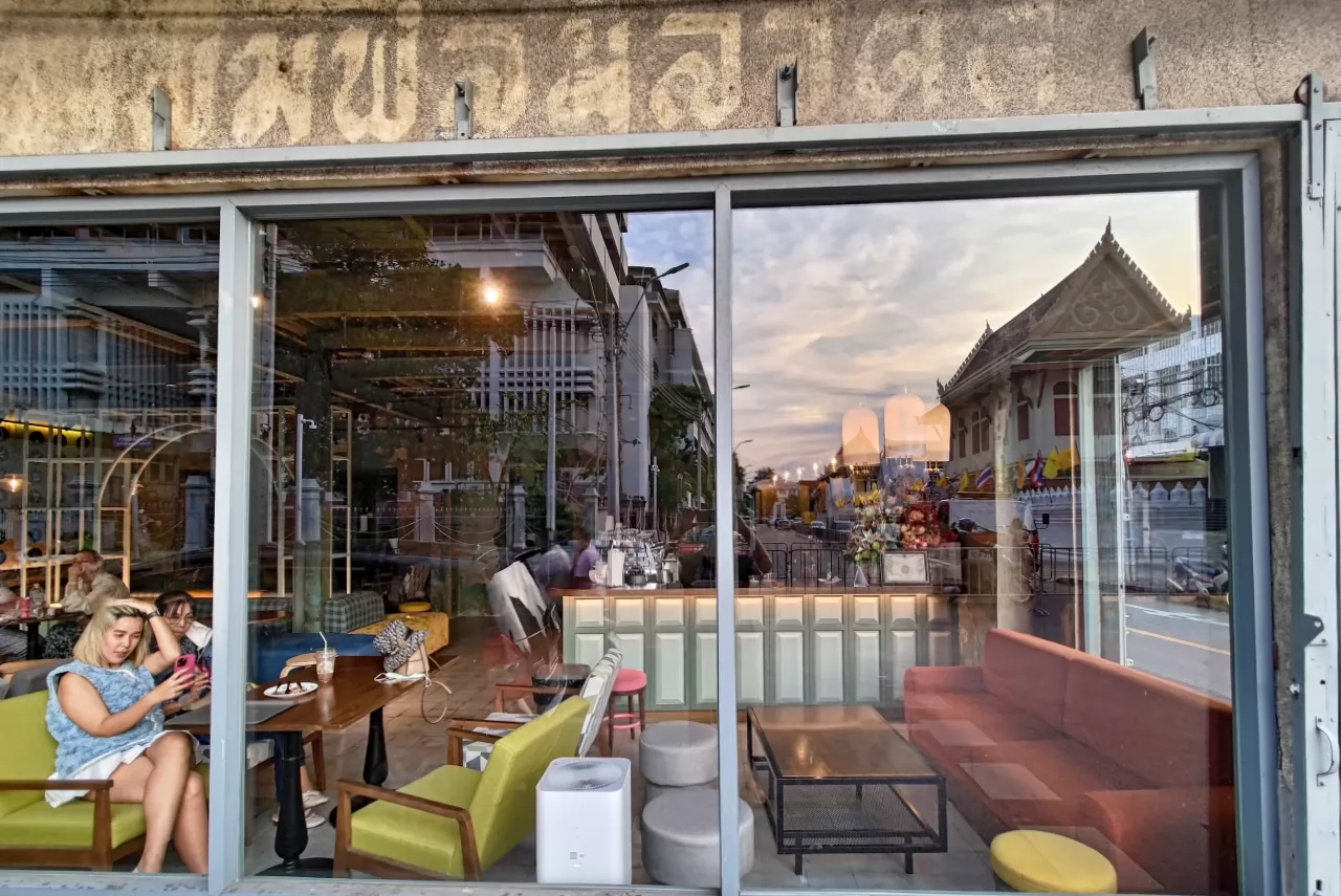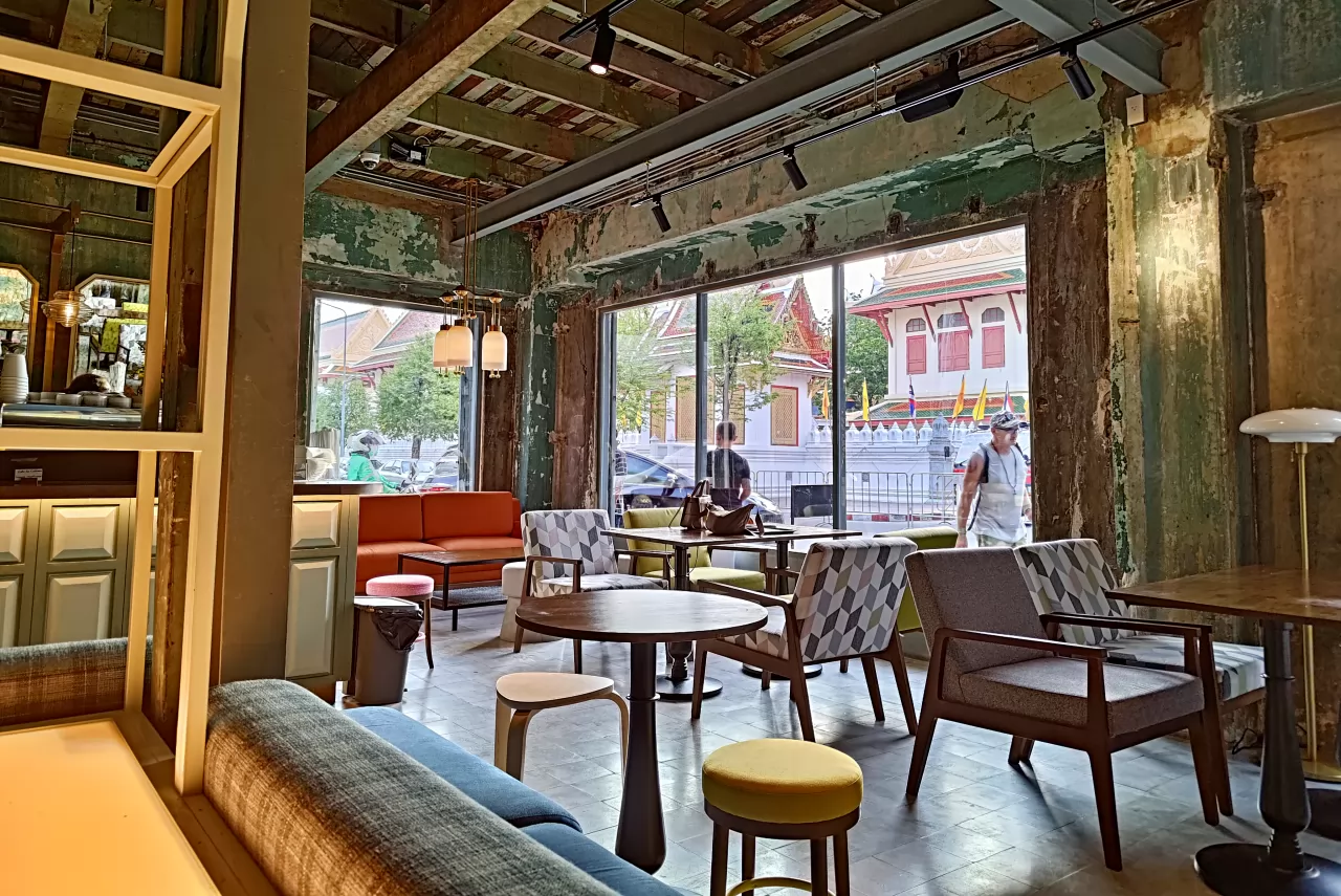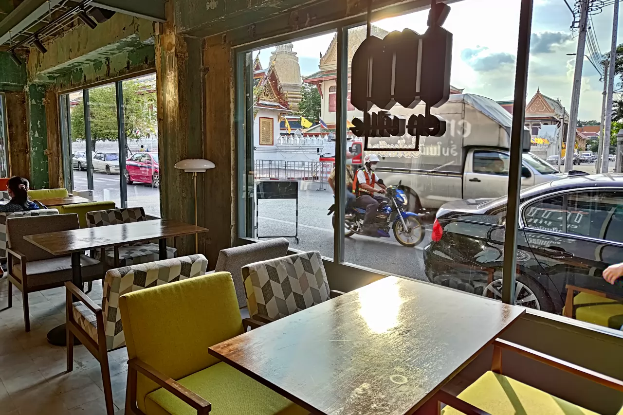 店斜對面就是百年的拉查波比托寺(Wat Ratchabophit;วัดราชบพิธสถิตมหาสีมารามราชวรวิหาร),坐在窗邊,就能欣賞到老寺的風景。