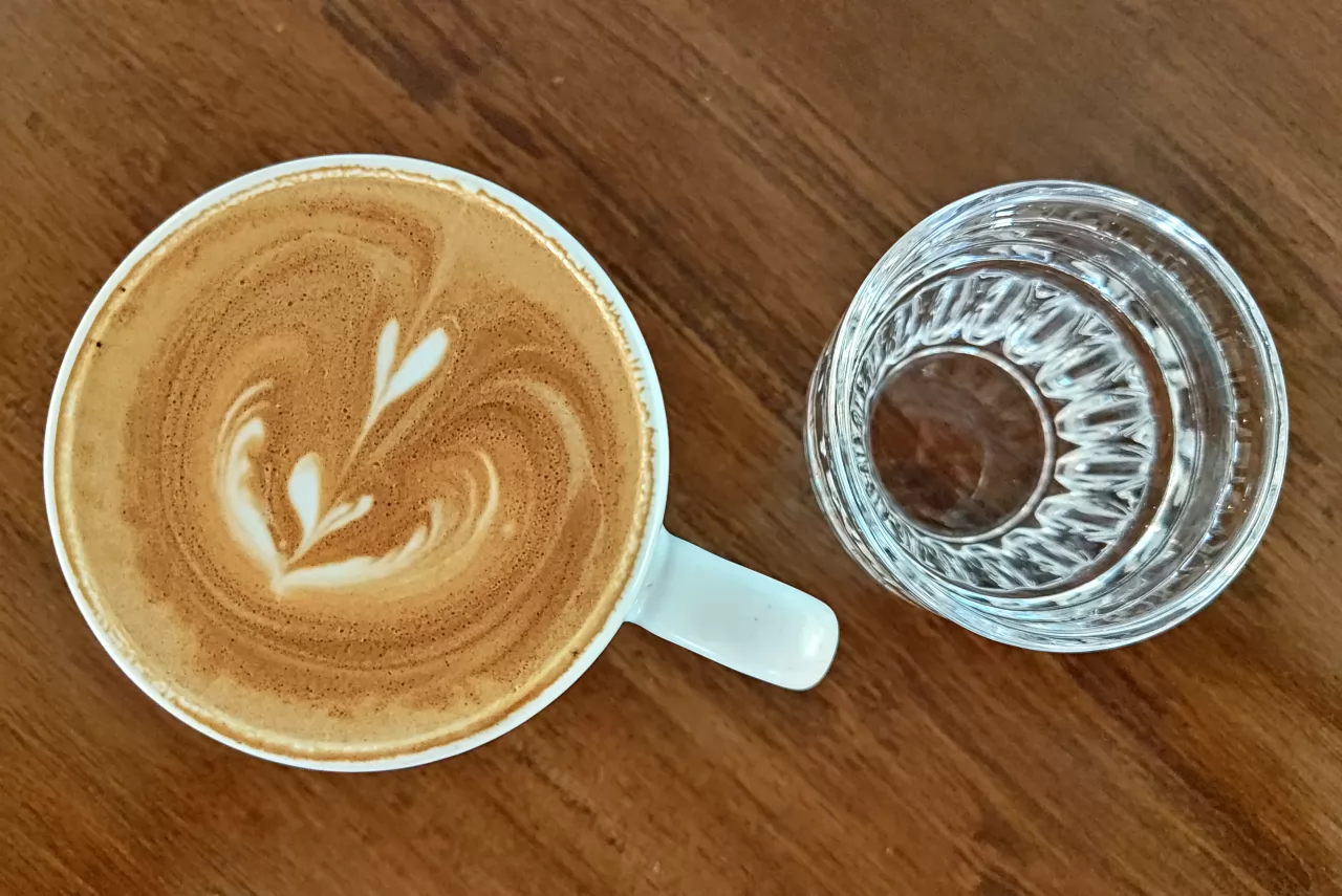 熱拿鐵1杯120銖,還附上1杯水。