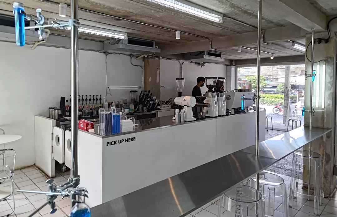 Pour Over Lab是以「實驗室」為主題的連鎖咖啡店,相當有創意,咖啡亦相當香醇,在一票網美咖啡店中殺出,Siam Discovery、ladprao 71分店停止營業,EKKAMAI分店則是暫停營業,曼谷目前只有PHETCHKASEM分店。