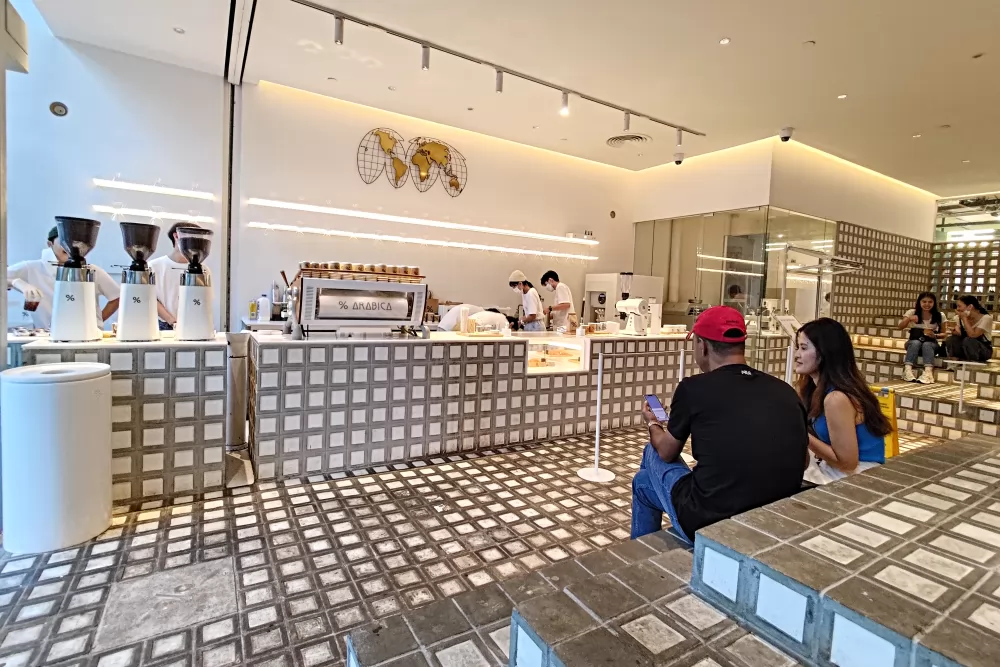 日本的% Arabica在京都嵐山分店打開知名度,隨即拓展到各國,2021年初在曼谷Central World開設第2家分店,由奥地利建築工作室Precht設計,靈感來自泰國的「聊天」、「寺廟」文化,用7,000多塊手工磚組合台階、座椅、櫃台和牆面一體成形,搭配潔白純淨的牆面,獨樹一格,成為網紅打卡熱點!