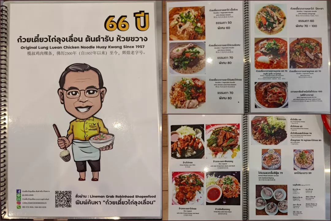 拿到菜單,有泰文和英文,也有圖片,不用擔心點餐的問題,這裡提供的是雞肉、豬肉和肉丸的粿條、麵(冬粉、MAMA泡麵)等;還有雞肉和豬腳飯。