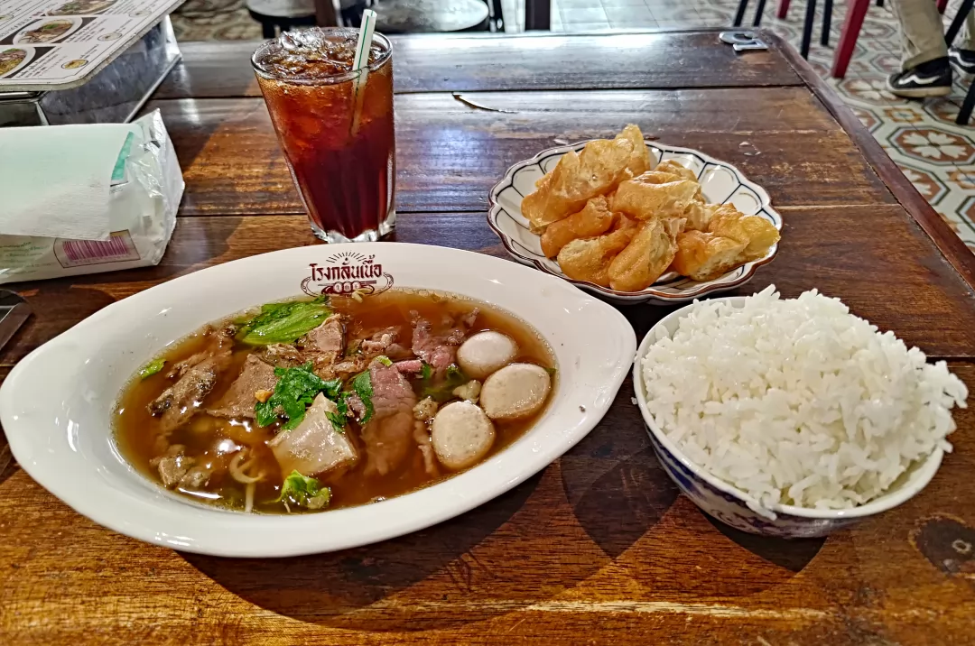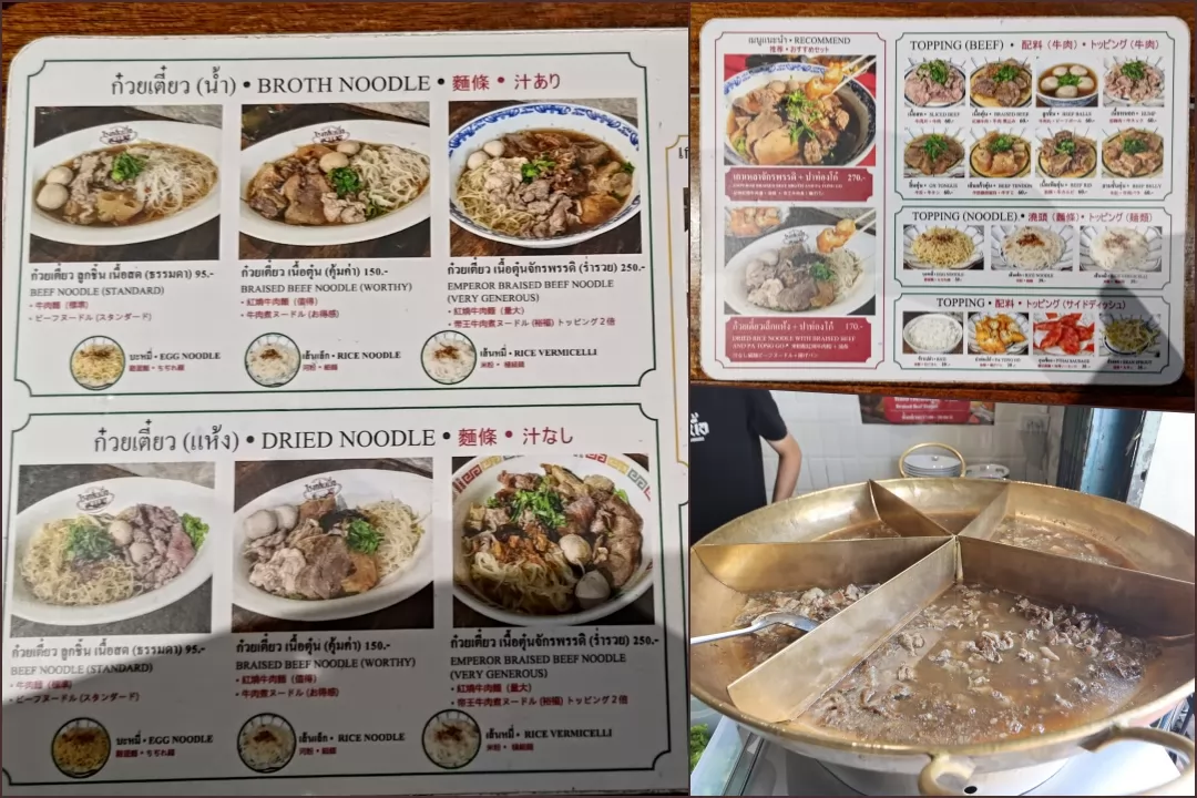 這裡提供的多種口味,以牛肉麵和紅燒牛肉,有麵、寬和細粿條、冬粉等4種選擇,分乾和湯,以份量分標準(95銖)、大碗(150銖)、特大碗(250銖)。也有單獨提供牛肉片、牛舌、牛筋、牛肉丸等配料,1盤60銖左右。