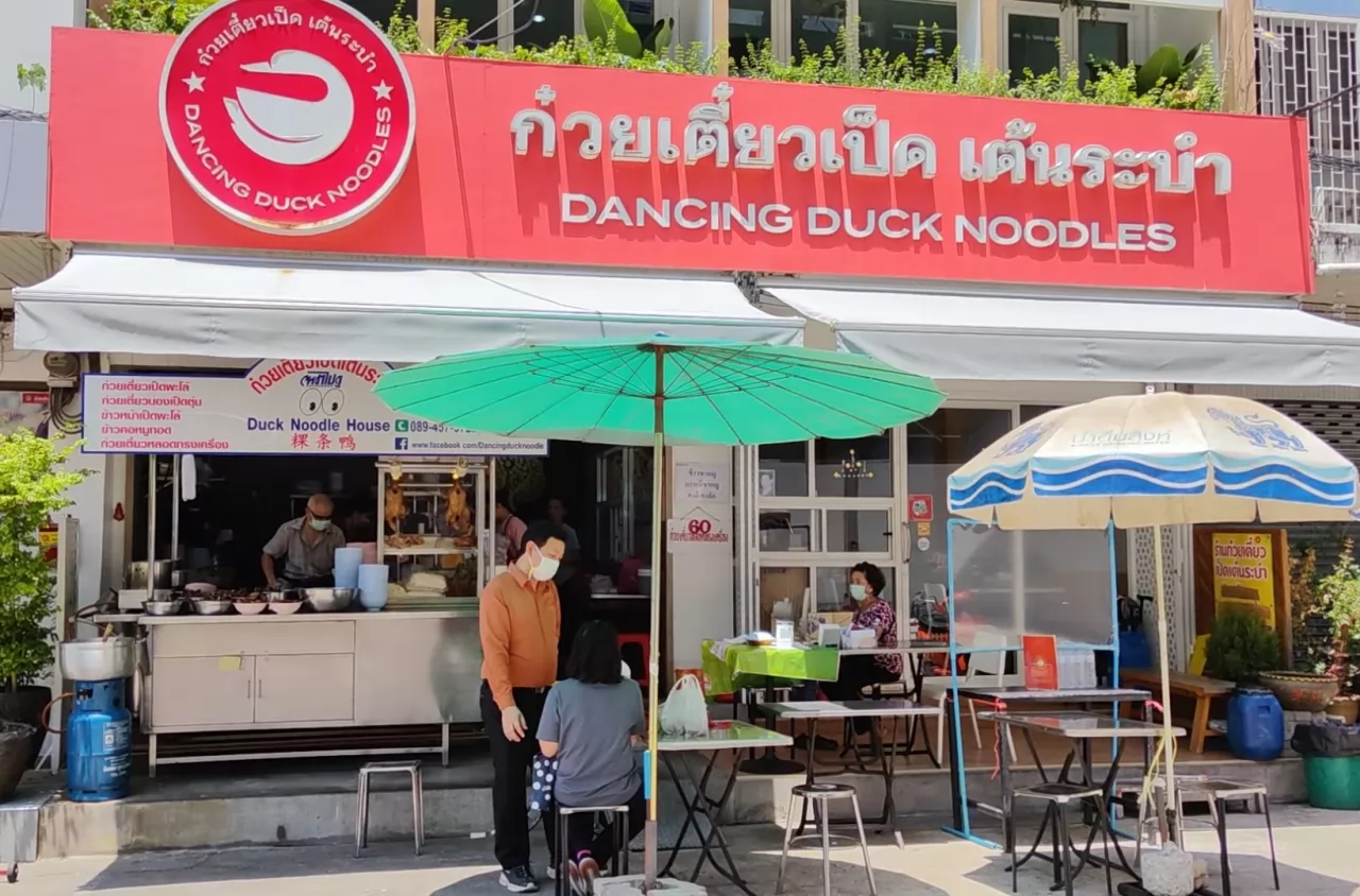 之所以會稱之為「跳舞的鴨肉粿條(ก๋วยเตี๋ยวเป็ดเต้นระบำ)」,是因為老闆在店前攤位上煮粿條和放配料的動作,因為趕時間就像是在跳舞一樣。