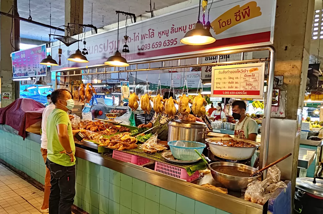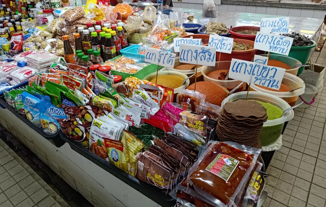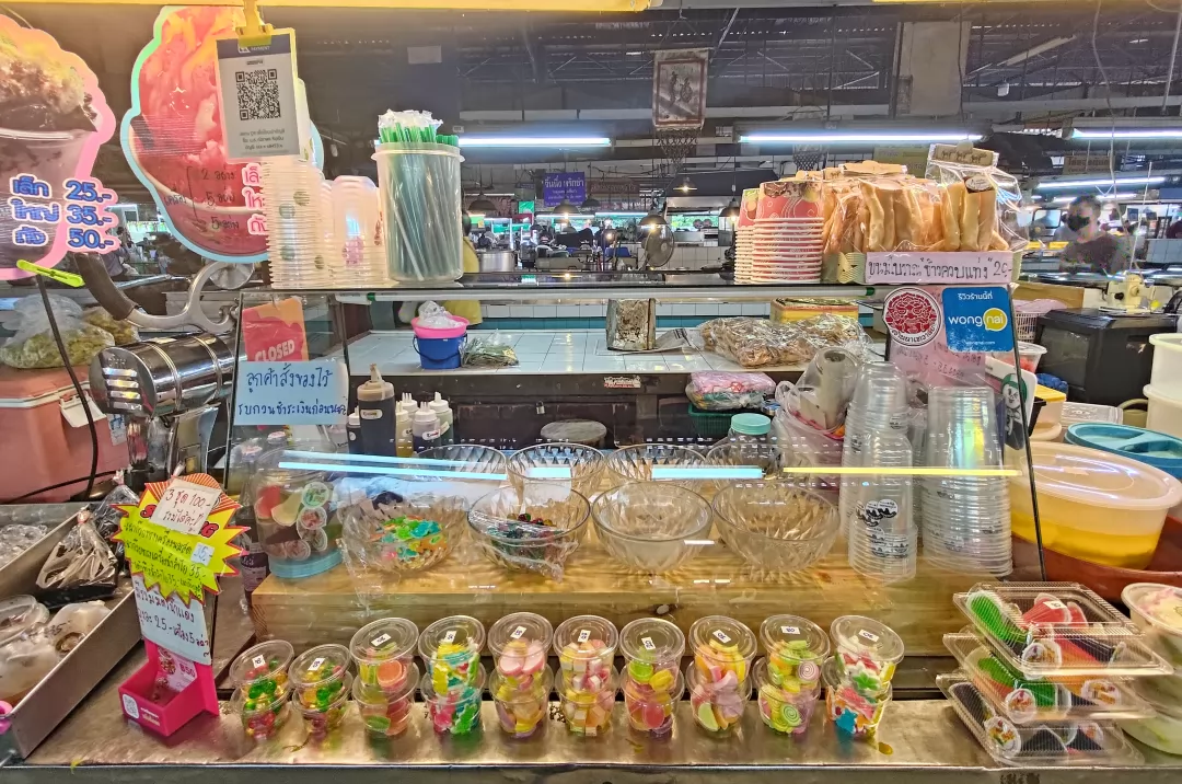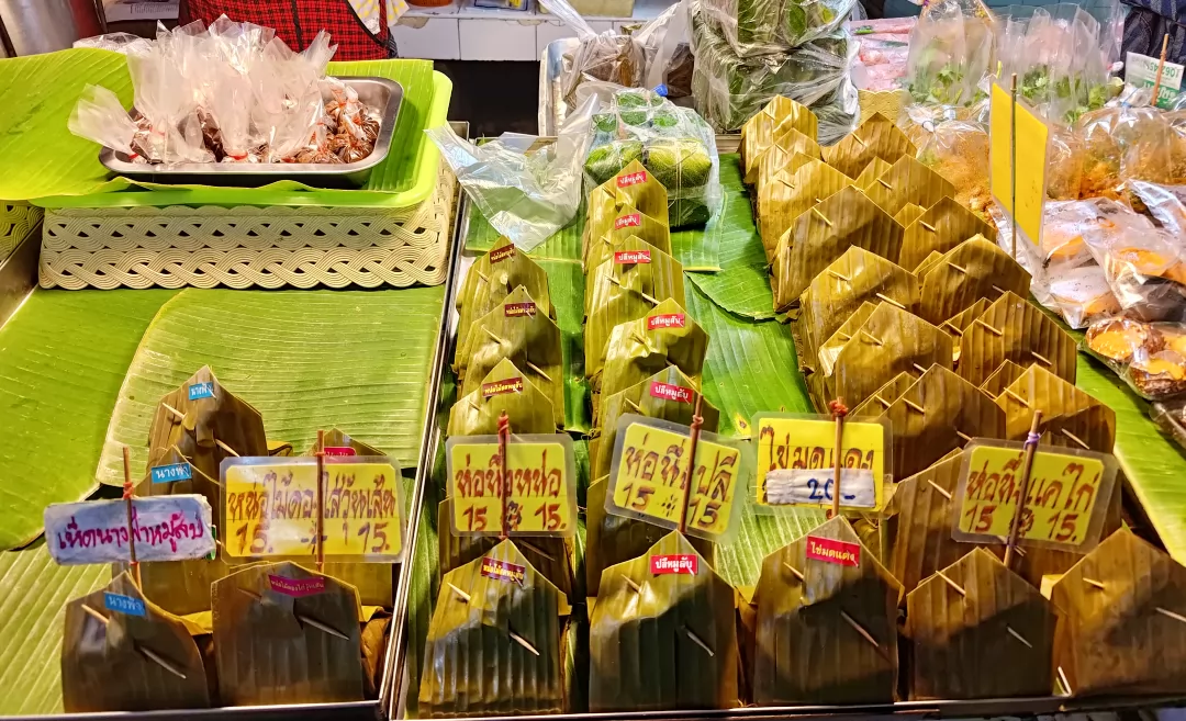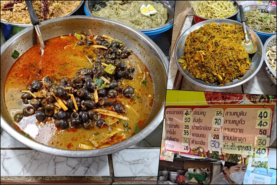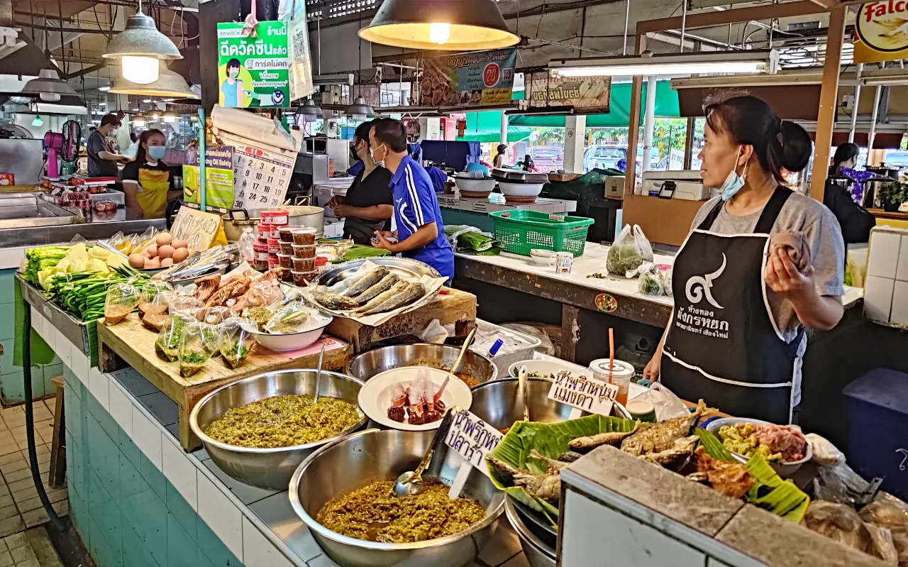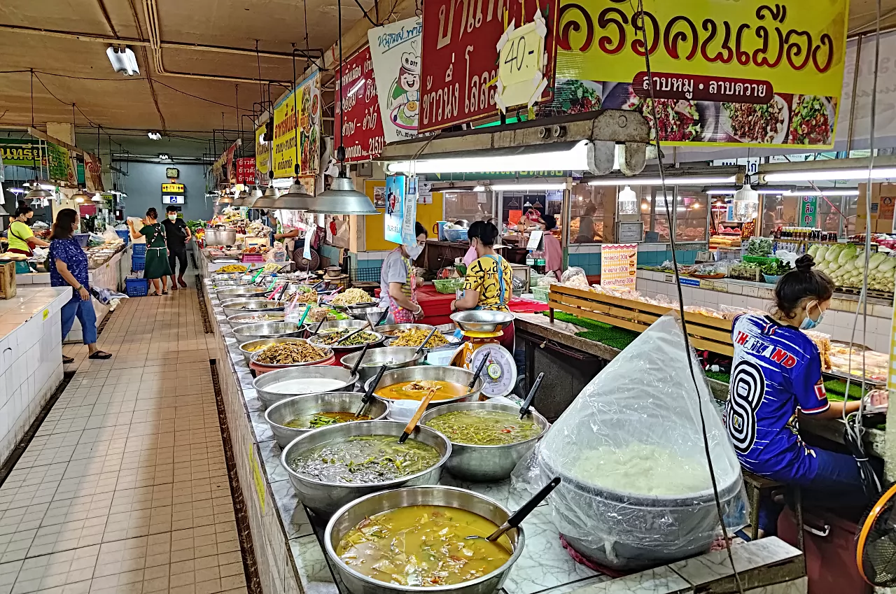 除了各類乾濕貨品外,街市旁更有熟食廣場,有很多平價地道美食,像是自助餐、麵食、雞肉飯、串燒,各種泰北小食,泰式甜品,糕點等等。