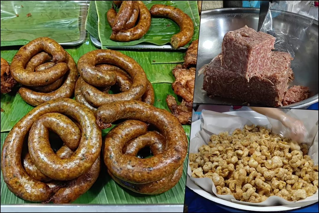 搭配糯米飯的泰北三寶—炸豬皮、青皮辣椒和炸雞,這裡都有;還有另兩樣特色美食—酸肉和香腸。