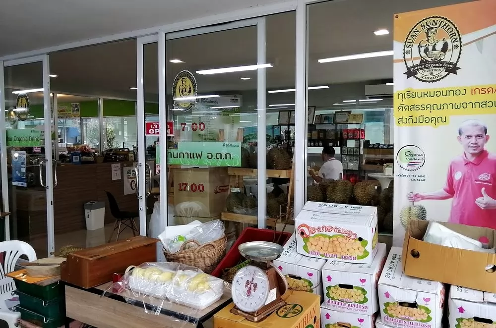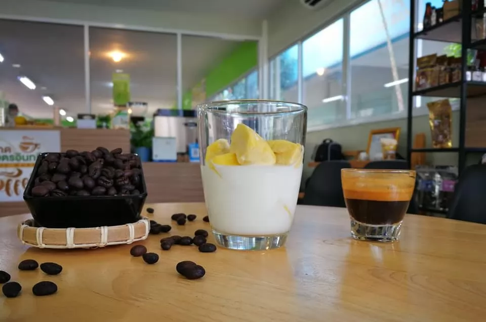 熱帶水果之王榴槤,也被泰國農產主人研發出來與咖啡搭配,目前所知,賣榴槤咖啡只有曼谷喔多哥(Or tor kor;อ.ต.ก)市場這家咖啡店。