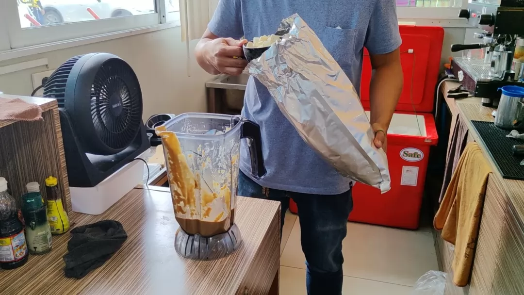 主打的招牌是Ice Durain Coffee,1杯120銖。製作的不是新鮮榴槤,而是真空處理過的榴槤乾,與煮好的咖啡摻雜一起,用果汁機打碎,倒入杯中。