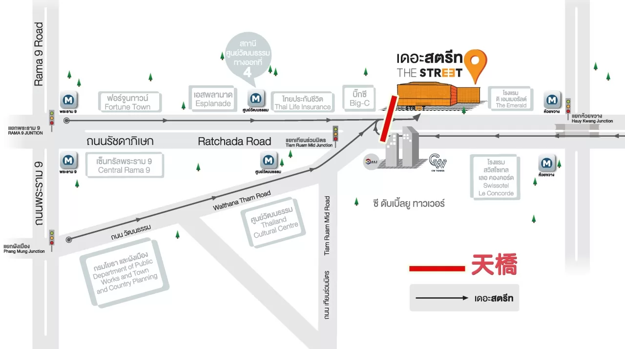 天橋建在拉差達路(Ratchada)上,連接The Street Ratchada百貨公司和CW Tower之間,寬近5米,總長超過200米。