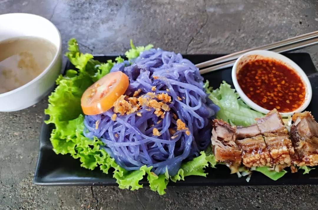 這裡的每一款食物都有蝶豆花的因素,顏值非常高,深受當地年輕人歡迎,消費並不高,口味也還不錯。蝶豆花粿條(ก๋วยเตี๋ยวอัญชัน)1盤50-60銖。染成藍色的粿條可以搭配豬肉片、豬肉末、泰北酸肉、烤豬肉等等,還附上一碟香辣的蘸料。