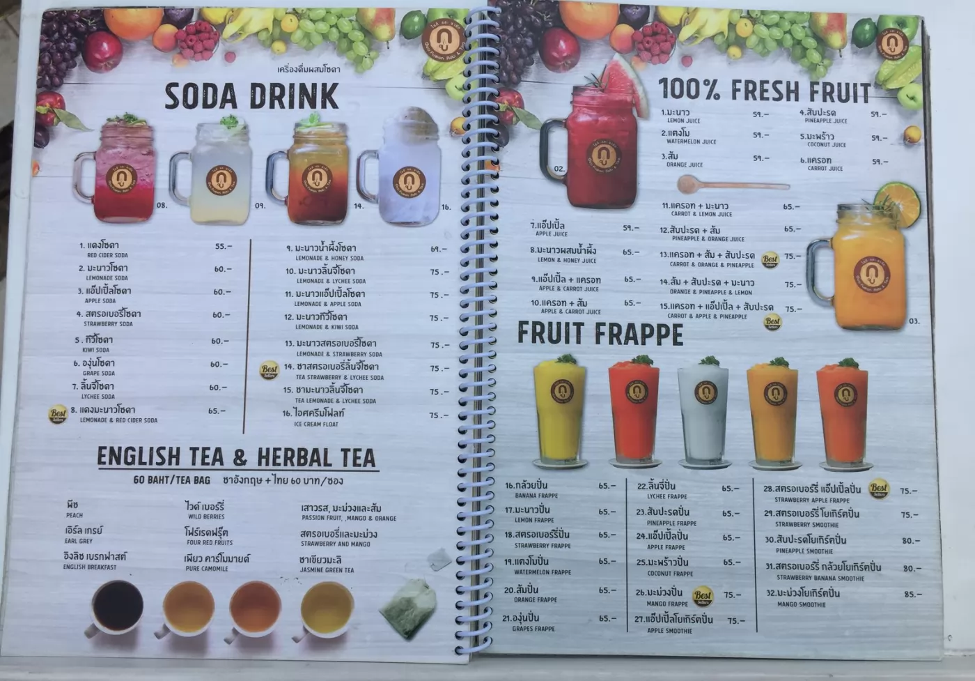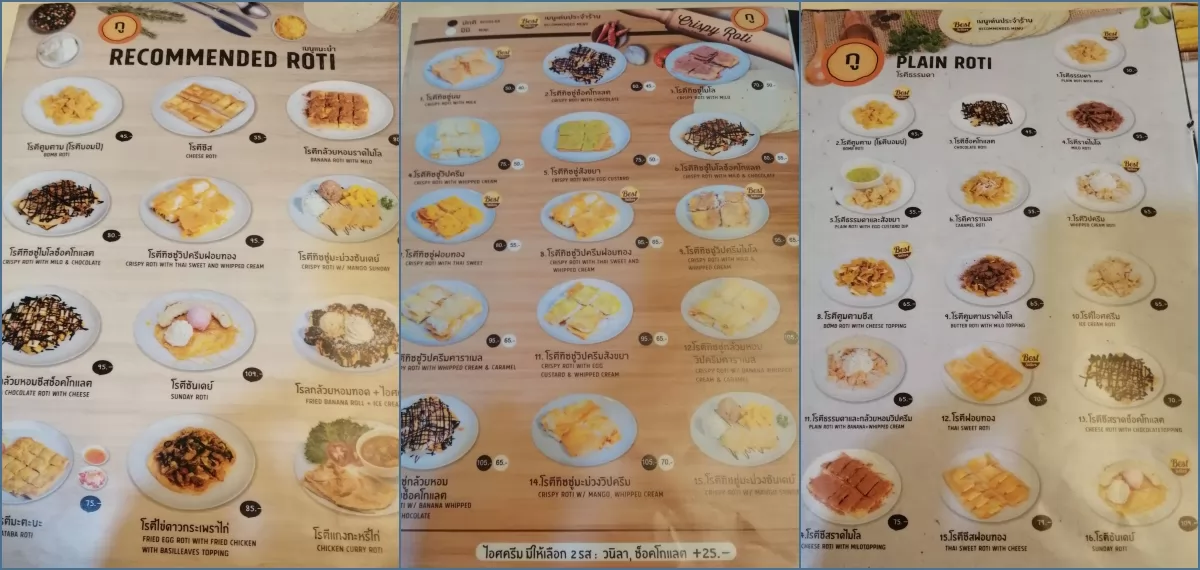 Menu有泰、英文和圖片,Roti、蛋糕、冰淇淋、吐司、義大利麵和套餐飯食等。這裡有上百種口味的Roti可選,有甜、有鹹,口味獨特,難以在清邁找到第二家。每種roti在45-129銖之間。