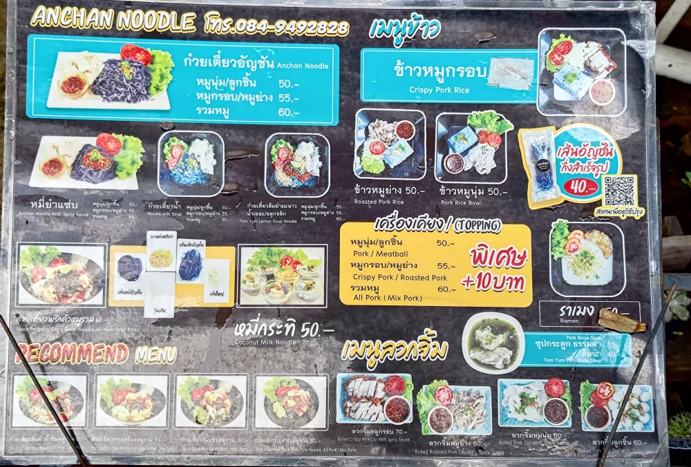 提供泰國正宗菜色,偏辣,有很多不同口味可以選,香腸咖喱麵、海鮮咖喱麵、煎蛋咖喱麵等,1碗價格從90銖起。其中195銖的超級大碗,全部配料都有,很適合大胃王的朋友。