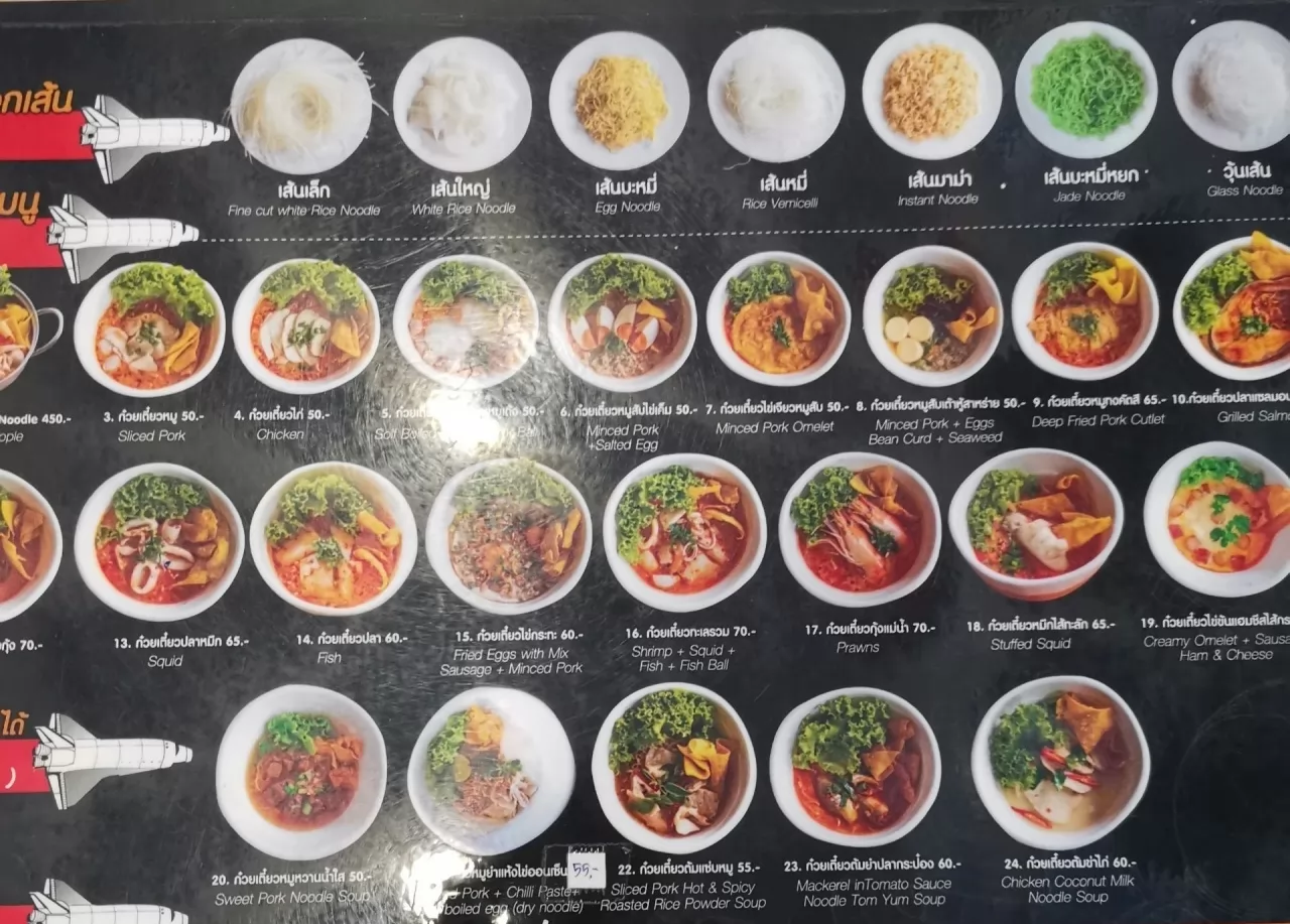 這裡的選擇很多種,基本上有「牛腩(筋)、牛雜和牛肉」,可以搭配麵、粿條、米粉和飯,一般價位小碗60銖、中碗100銖、大碗180銖;牛肉麵不同於台灣的紅燒牛肉麵,紅燉的牛肉和消甜的湯,吃起來的味道就不一樣,小碗100銖、中碗180銖、大碗250銖。(價格可能已有調漲)
