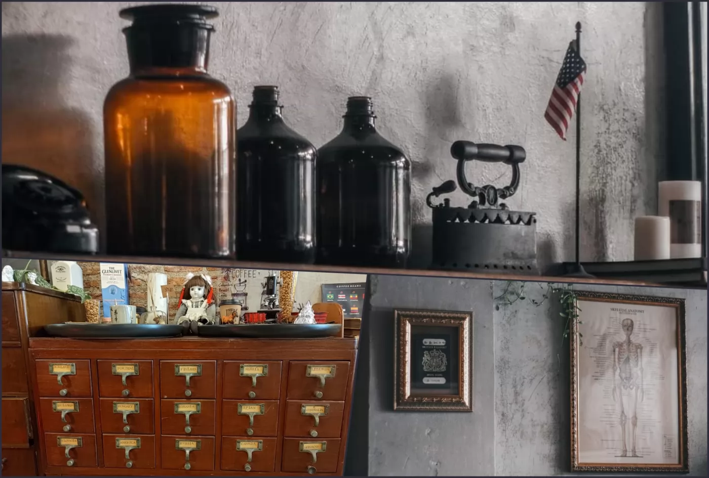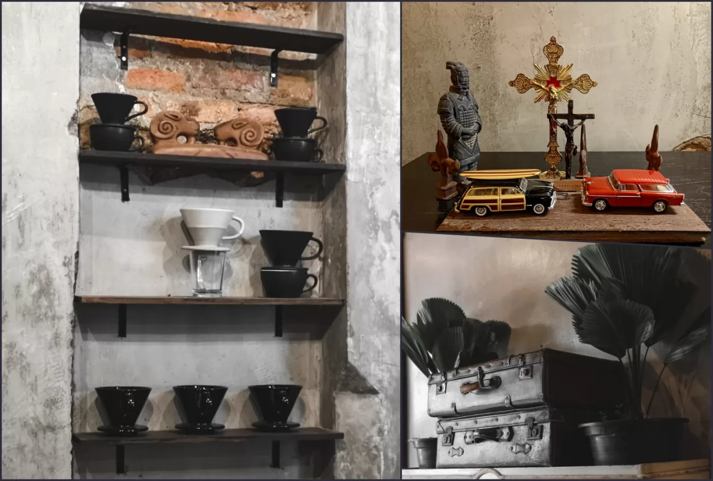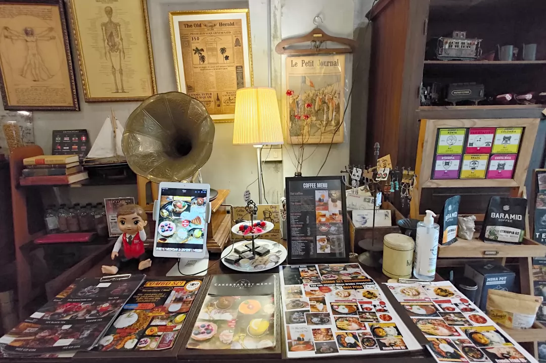 店各項佈置裝潢顯出心思,像窗框的鐵欄架,拉鐵閘,木樓梯,吊扇,在舊樓常見的半身推門,木傢俱等等,年輕一代可能從來未見過。還有許多古董、地圖、海報和黑白照,有機會來參觀一下也很不錯。