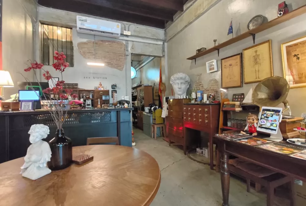 離華籃朋火車站約7-8分鐘步行距離,店前上方掛了一個復古的鐘(跟古舊火車站的一樣),加上門牌是350,因此,這就是店名350 Station的由來。