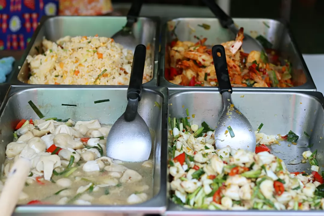 自家門前的小吃攤車上,每天有15-20種以海鮮食物為主的菜單,大蝦,鮮蟹,大塊魚,尤其是咖哩(黃、綠咖哩)的菜,配菜的用料也是上好的,味道濃鬱,加上的椰奶,也可以淋在米飯上。
