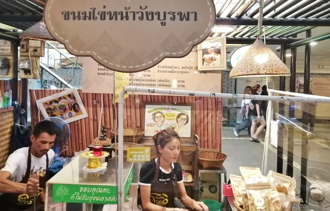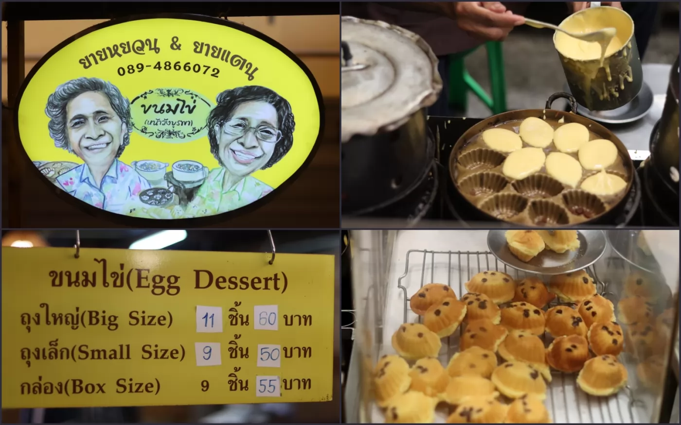 元、登兩位奶奶一手創建的古早碳香雞蛋糕(ยายหยวนยายแตน ขนมไข่หน้าวังบูรพา),在老暹羅購物中心(ดิโอลด์สยามพลาซ่า)1樓外圍擺攤販賣,現場製作的新鮮,泰式小雞蛋糕餅,碳香的作法來自元奶奶和登奶奶。路過都會被雞蛋糕的香味絡吸引過來,難擋這項傳統小吃的魅惑。
