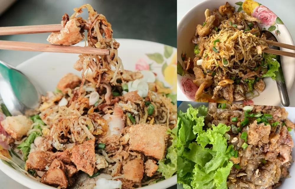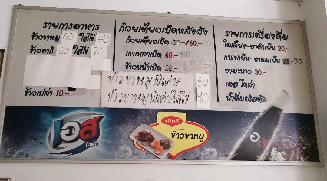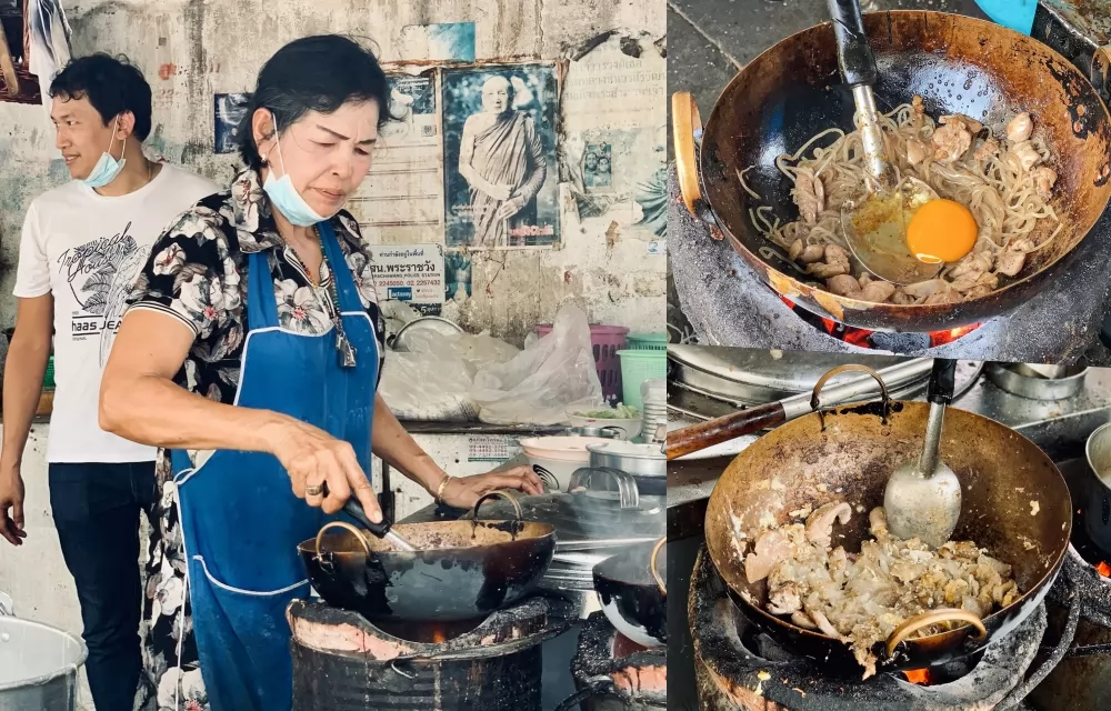 這是一家秘製的炭火炒雞肉麵店,可選寬粿條和細粿條、麵條,紅燒豬肉、雞肉塊、魷魚,配料有青菜、蛋、豬皮(可以放炸豬皮)等,在熱鍋熱炒,味道有點鹹,有放糖帶甜味,價格60-70泰銖。