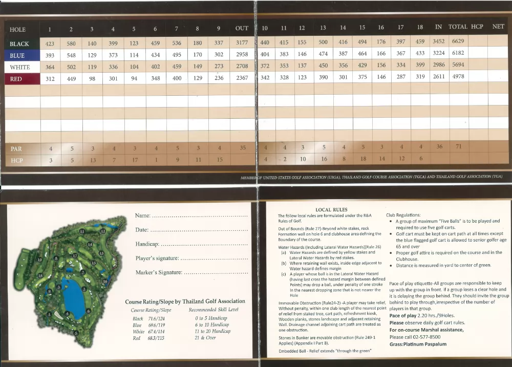 球道長度:黑色TEE台7058、藍色TEE台6449、白色TEE台5971、黃色TEE台5430碼、紅色TEE台50397碼