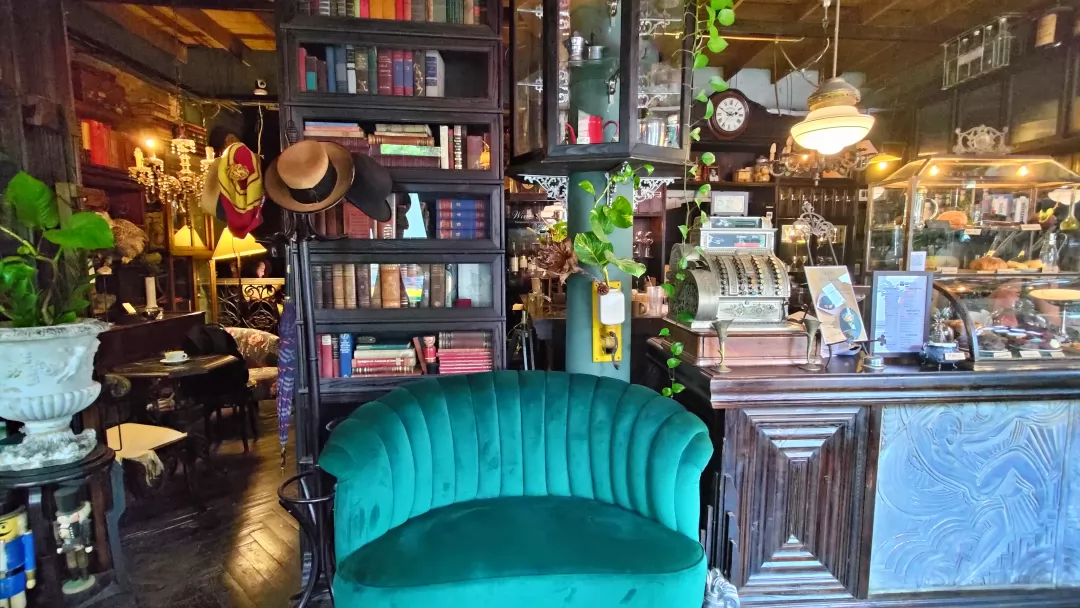進到店裡,氣氛就截然不同,右側吧台精緻典雅,左側擁擠的書房擺滿舊書、老傢俱、不知時代的老盒子….歐式復古氛圍十分濃厚,每樣物品亂中有序地堆砌出一種巧妙和諧的空間感,連細微的角落都能令人目不轉睛。坐在這儼然就是一座披著咖啡店外衣的「博物館」,可以慢慢觀賞。