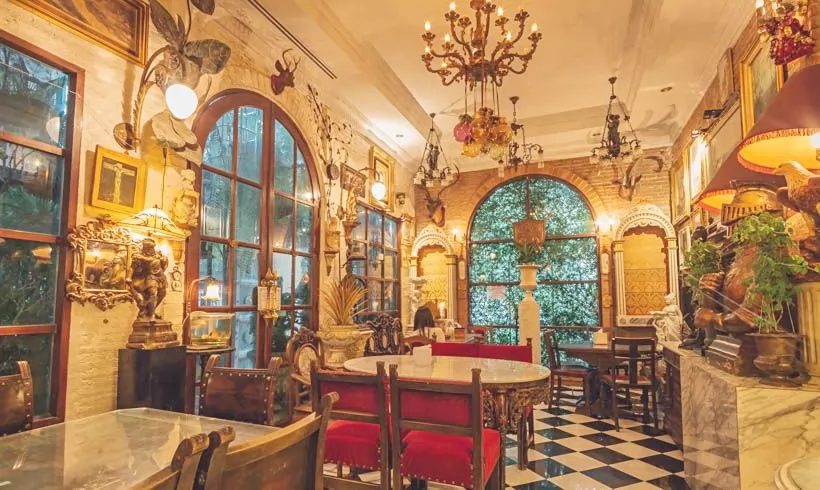 進入店內,絕對會為之驚豔,不管是門口裝飾,還是店裡的佈置,從地板到天花板,窗戶和牆壁都裝飾著古董,隨處可見的雕塑,精緻的沙發,復古的吊燈,入眼所及,無一不是極具歐式風情的陳設。