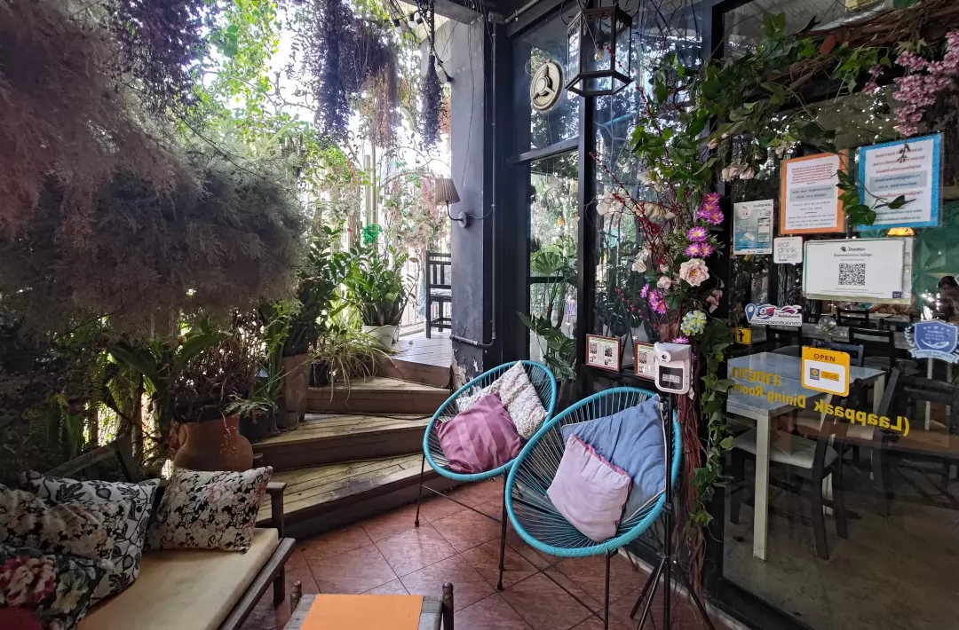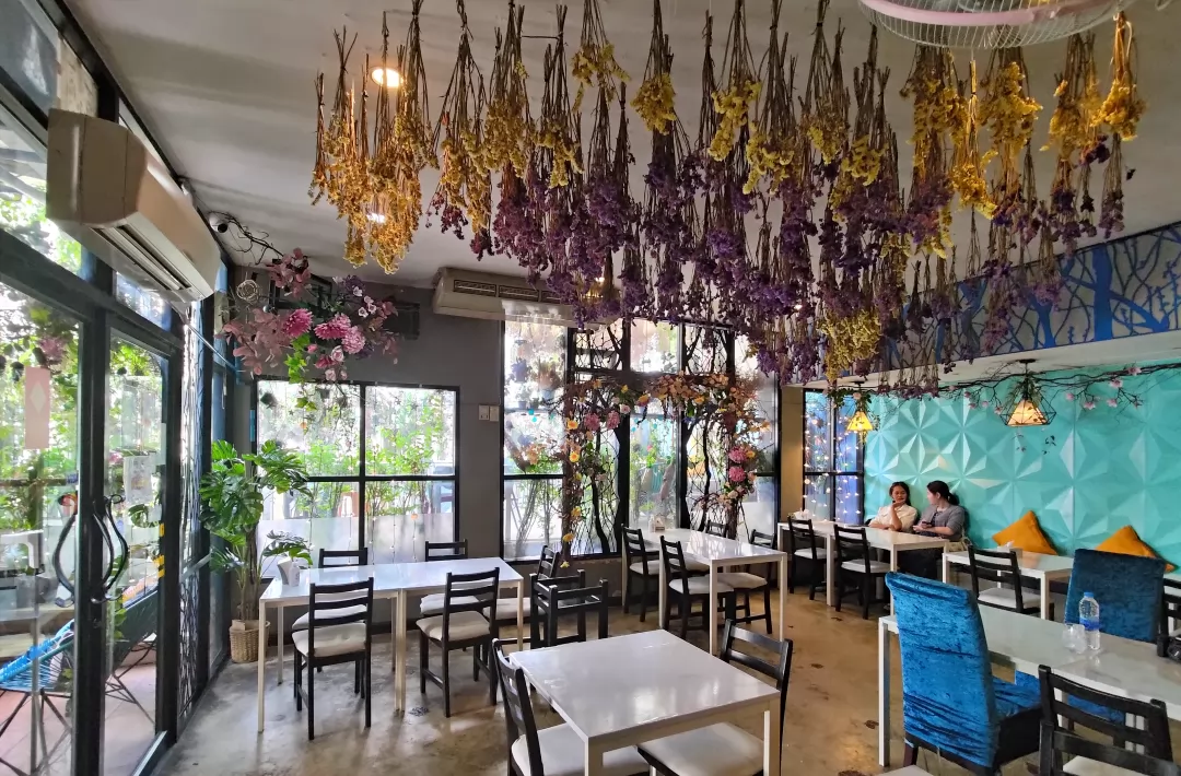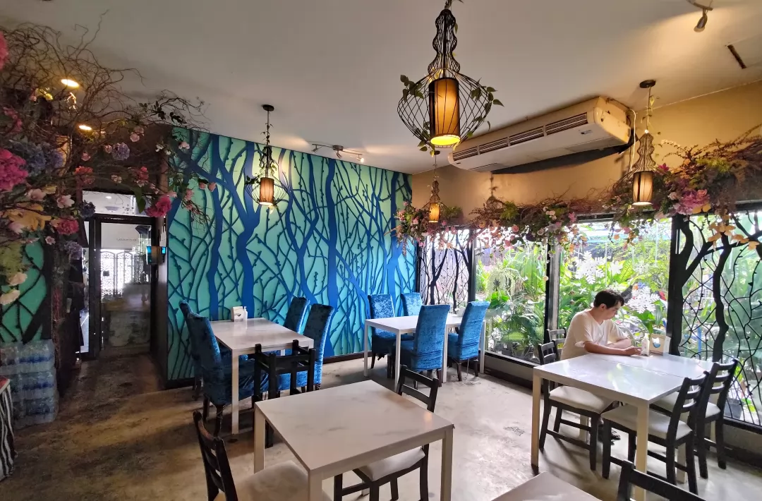 整間店都是花草綠植被,從外面看,根本猜不到裡面有裝潢精美的美食店。