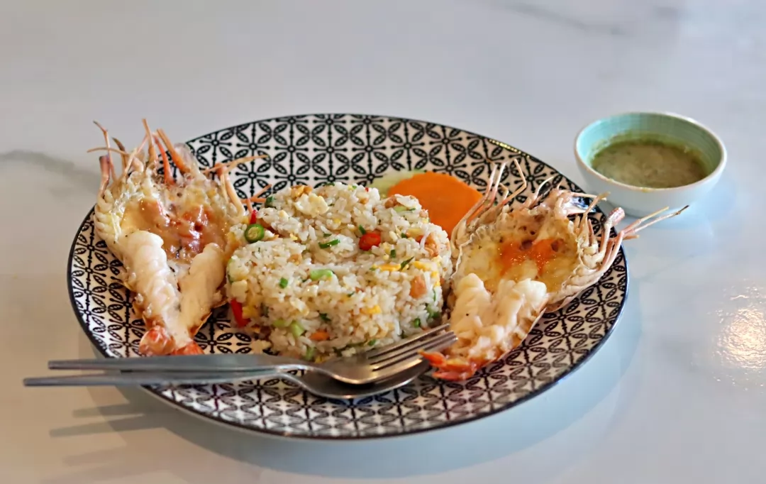 但,比這更重要的是….這裡的大蝦美食,喔…辣椒蝦炒義大利麵、鮮蝦炒飯,都是159泰銖,這個價格真的很划算。
