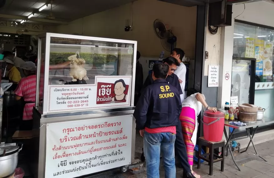 曼谷舊城區有很多海南雞飯的老店,各有不同的風味,像怡姐海雞飯(Khao Man Kai Jae Yi ;เจ๊ยีข้าวมันไก่)就有兩大特色:用炭爐煮出來的白飯和新鮮的沾醬,很多老饕客就是愛這一味!