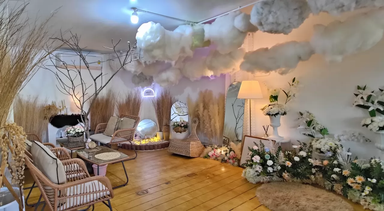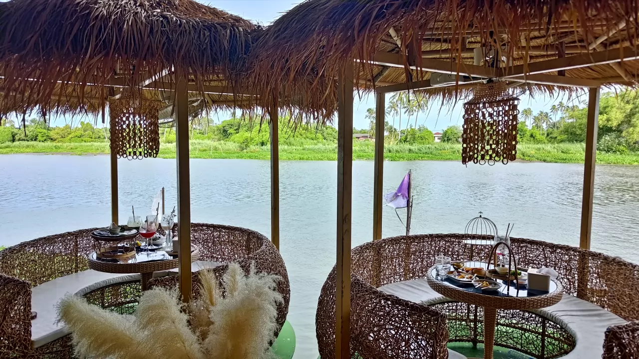 內部裝飾強調天然材料,無論是竹子、香根草,包括可愛的白色和灰色的蓬鬆花朵,給人一種童話般的感覺。有一個座位區可以把腿伸出來,欣賞河景。