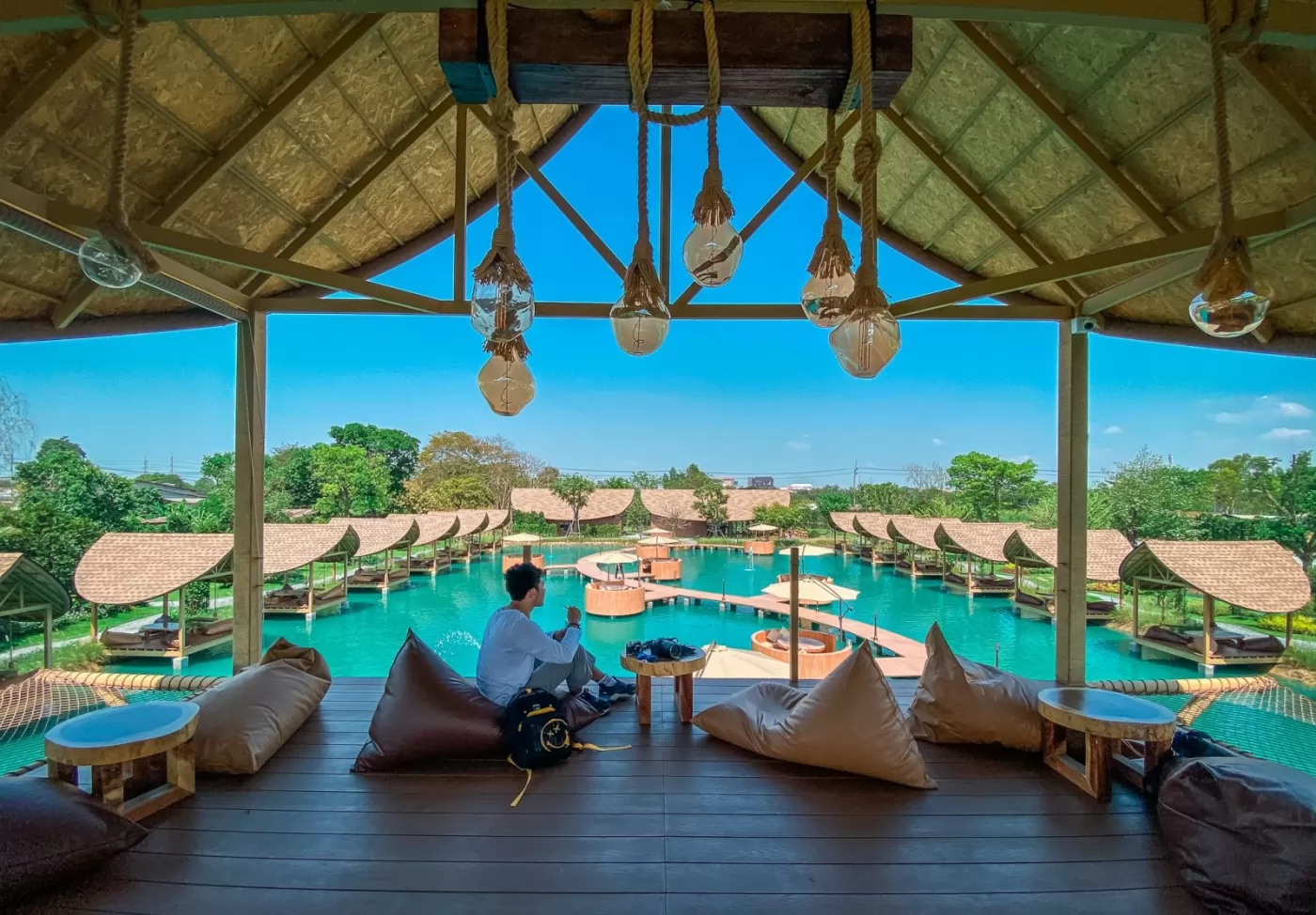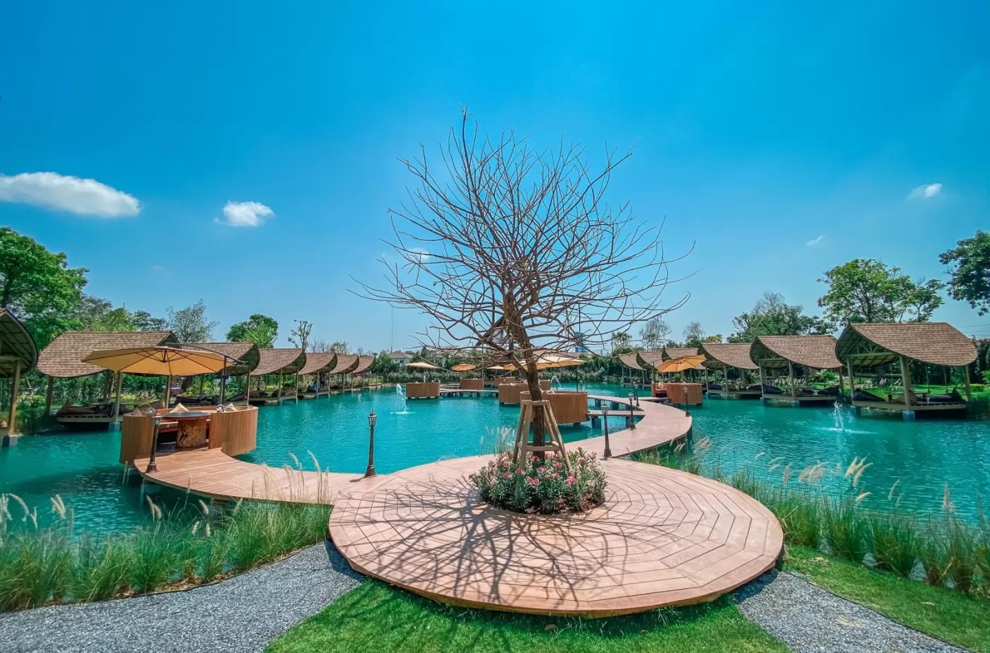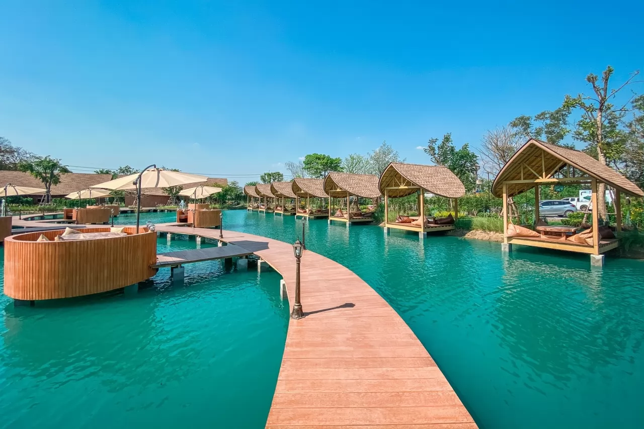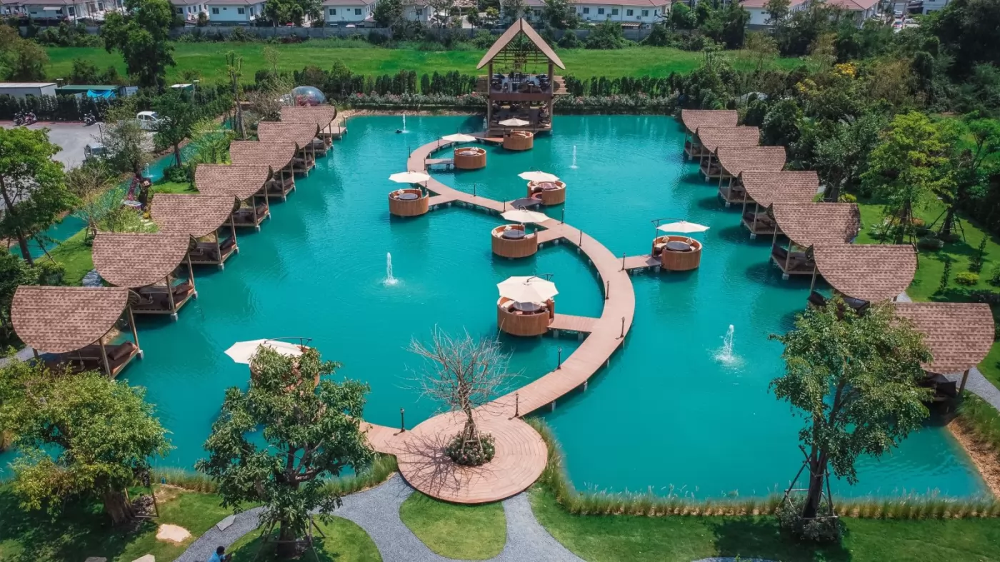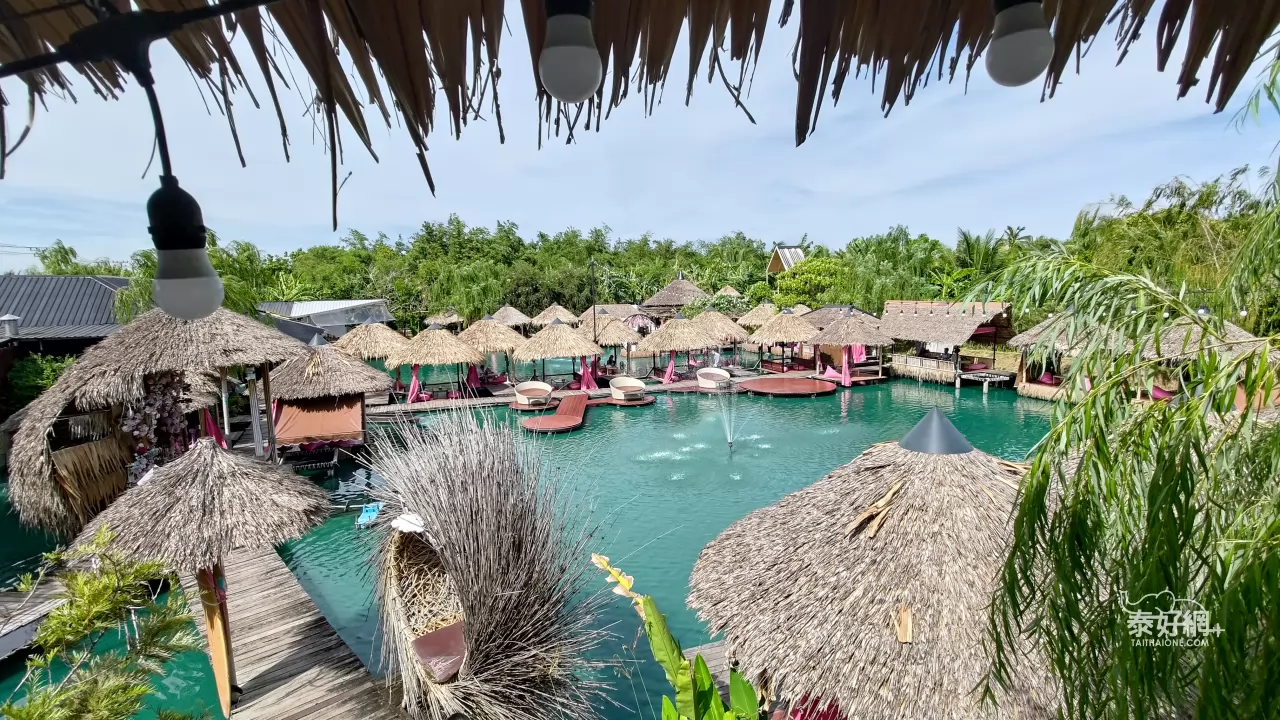 被台、泰網紅捧為泰國版的小馬爾地夫!在綠意盎然的田野中央,利用超夢幻湛藍人造池塘、泰式風格的木屋,打造出的美景,自 2021年開業以來,人氣始終居高不下的網美咖啡廳!