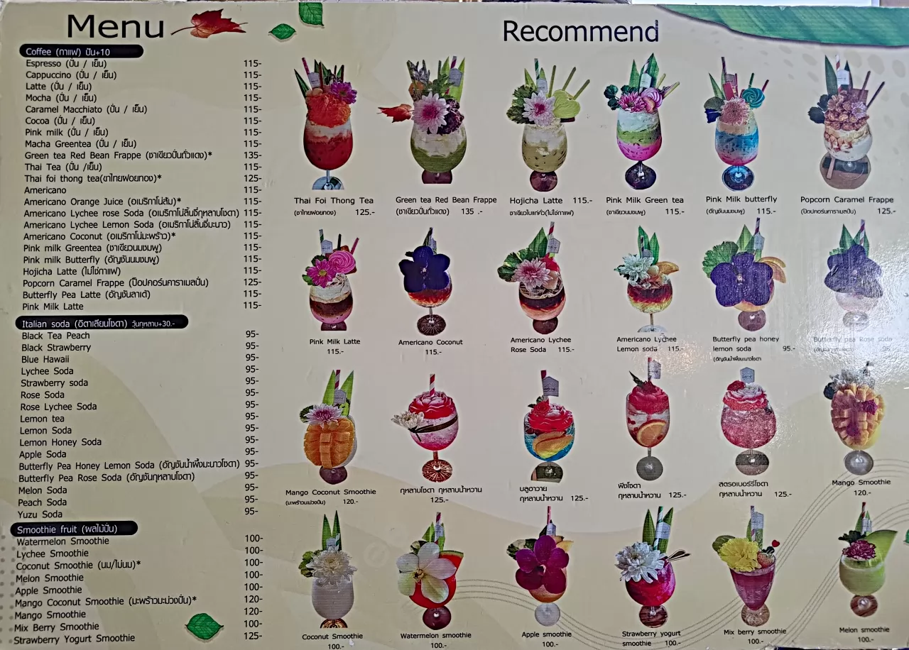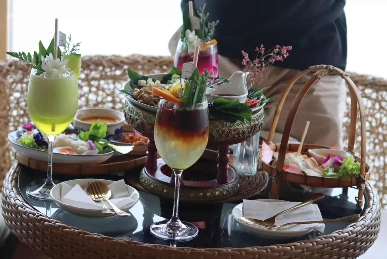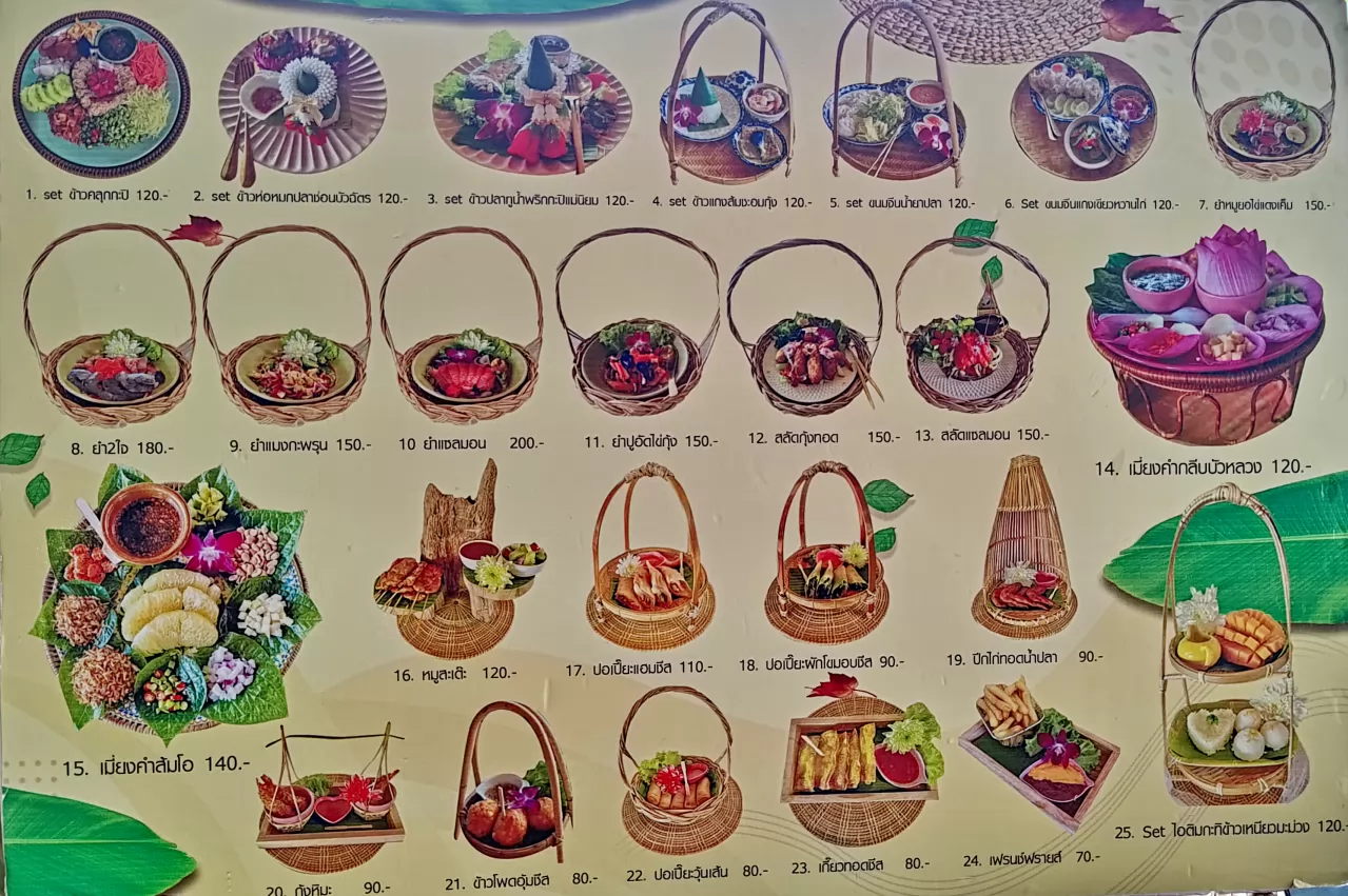 選位子,坐下來,享用與裝飾一樣豐富且令人放鬆的菜單,有鹹有甜的泰國菜,滿足注重健康的人士的需求。火腿起司春捲,110泰銖,外脆內軟,餡料十足,太滿足了。泰國傳統美食—Miang Kham套餐,115泰銖,很好吃。
