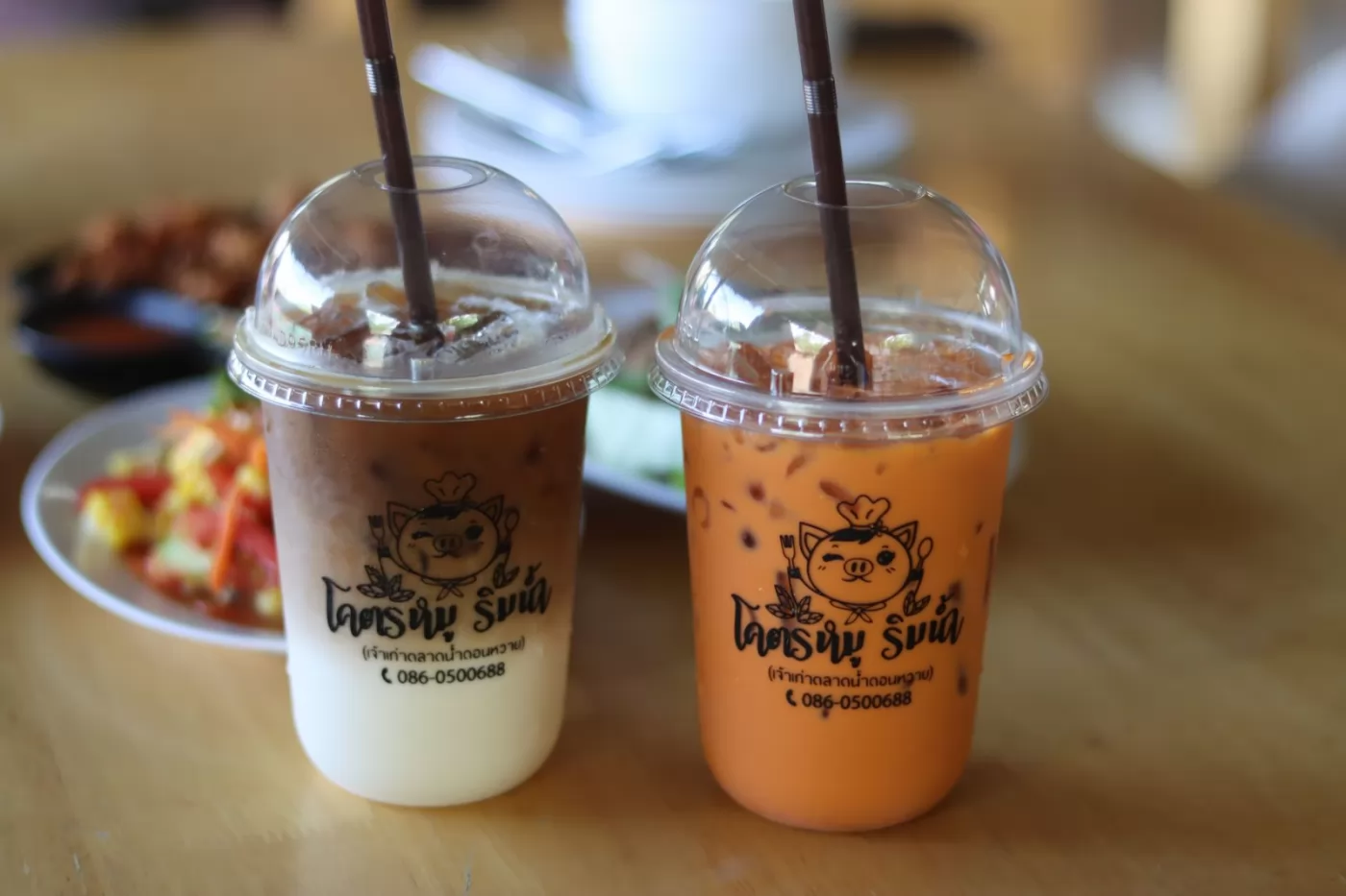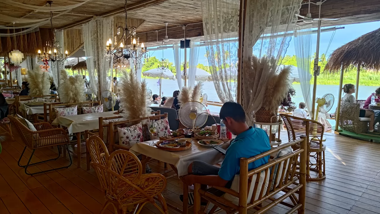 Kod Moo Rimnam (โคตรหมูริมน้ำ),從店門口一直到裡面氣氛很好,中間有一個綠色的池塘,座位間的屋頂和鋪滿尖草,給人一種夏威夷風格的氛圍。