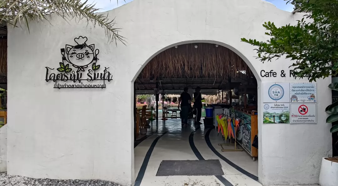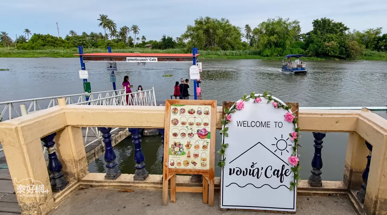 前往這家咖啡廳,要在地圖上訂位巴生庫威寺(Wat Klang Khu Wiang),然後把車停在寺廟裡,免費又安全,沿著有商家標誌來到寺廟碼頭,只需按鈴呼叫,就會有快艇來接,時間只要3分鐘即可抵達,這獨特的方式,很新鮮!