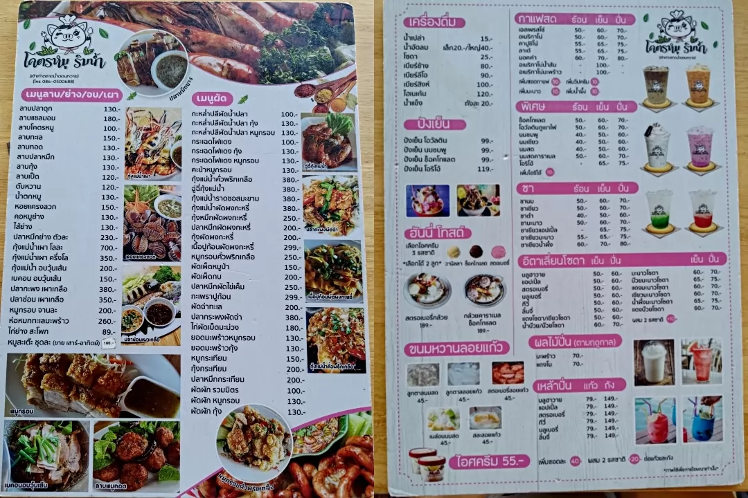 再來看看以泰國東北美食為主的菜單,因為店名有Kot Moo,豬肉菜單肯定是重點,招牌菜是 Miang Kot Moo,配有炸豬肉、蒸豬肉和豬肉香腸,配上米粉和辣醬。還有木瓜沙拉、油炸美食、酸辣海鮮湯等,約50-300泰銖左右。