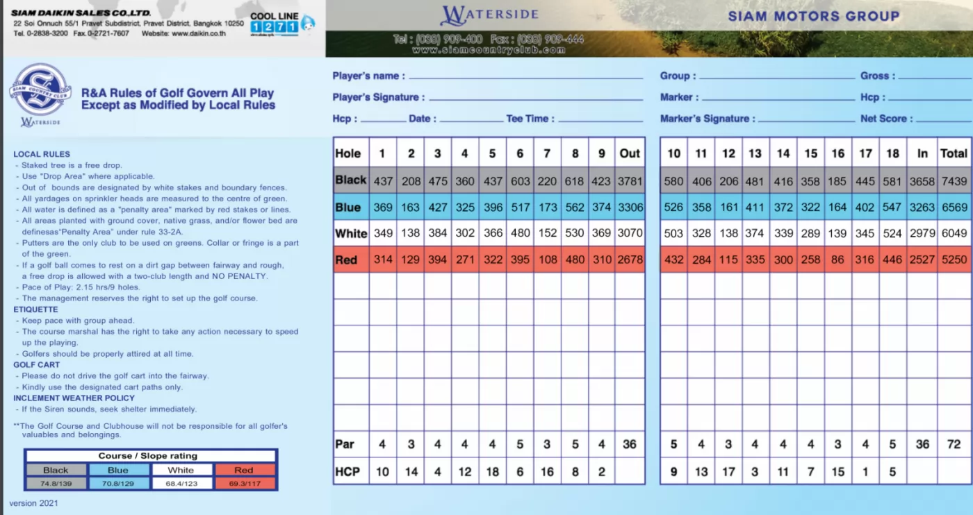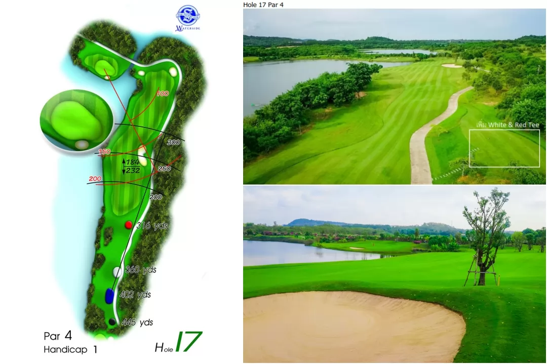 Siam Country Club Waterside是暹羅汽車場集團在芭達雅的第3個球場,由IMG設計,18 洞、72 桿,7439 碼,佔地 525 萊(200 英畝),顧名思義,這是以水障礙為主的球場,也是職業和業餘愛好者都能挑戰的球場。