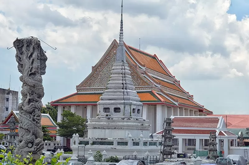 這座寺廟承載著悠久的歷史,始建於兩百年前,拉瑪三世皇時期建造,這座寺廟獨有的特色有一座白色的大佛塔(Phra Borommathat Maha Chedi;พระบรมธาตุมหาเจดีย์),周圍環繞18個小佛塔。入夜後打上燈光,更具氣勢。