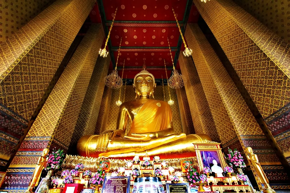 主殿內供奉的金佛像,高15公尺,當年依照大城府帕南春寺所供奉的Luang Pho Tho(หลวงพ่อโต)佛像造型鑄造,無論怎樣都無法平視,佛像的雙眼也呈現由上往下看著信眾的感覺。這座佛像,右手放在盤腿上,左手置於腹部上,久而久之,泰華人稱這種造型的佛像為三寶公佛。