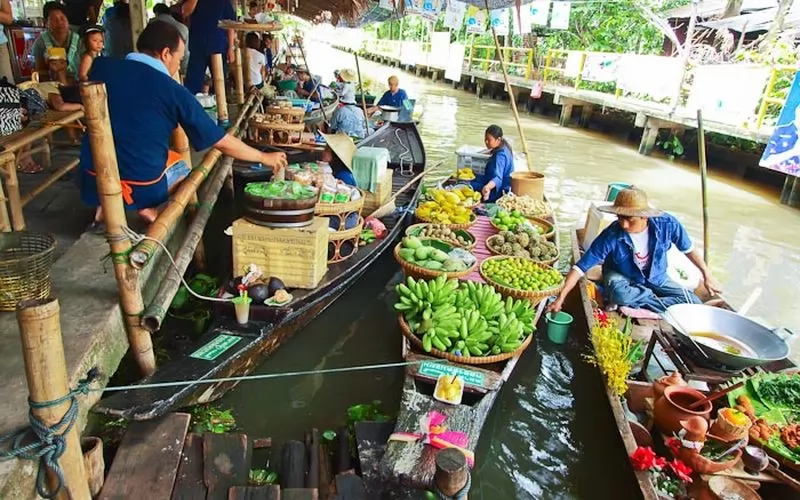 美食一直是遊玩水上市場的主題,在河岸邊販賣各種的美食,湯麵、泰式炒河粉、泰式米粉或蚵仔煎,價格實惠,氛圍輕鬆愉悅,而且趣味十足。