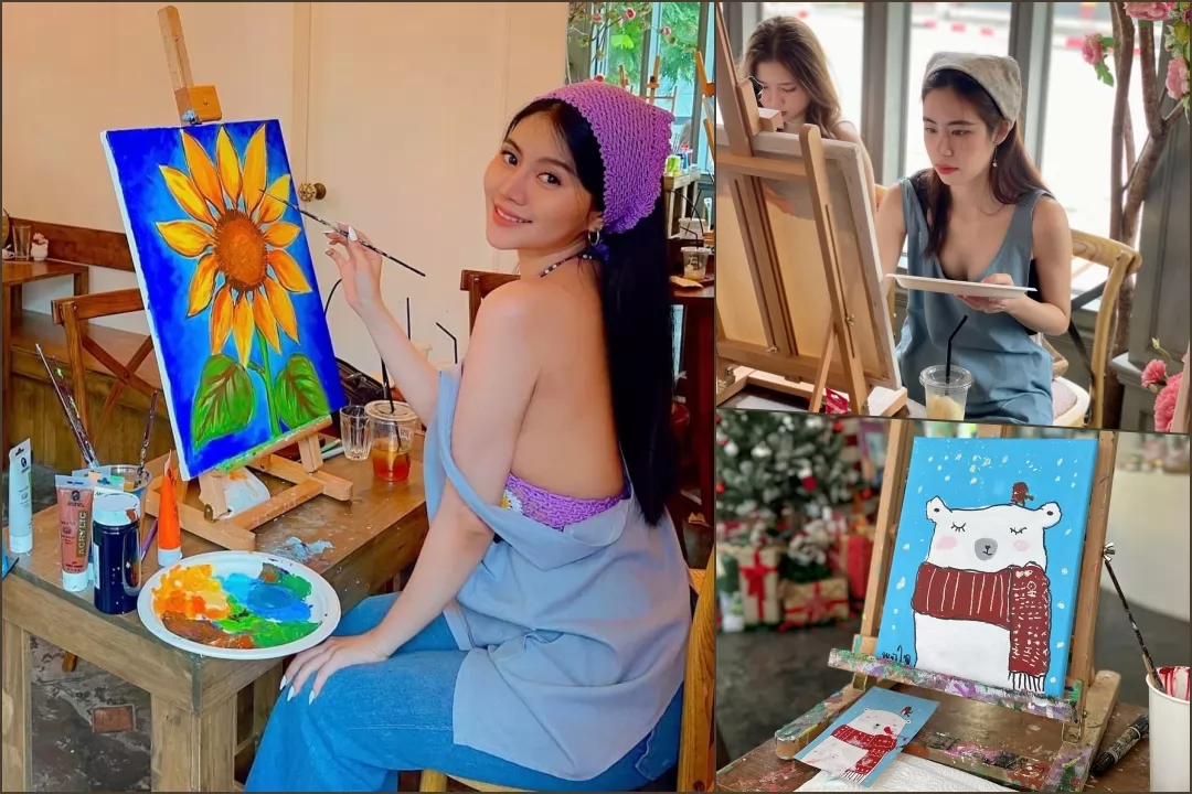 店裡有著一座座畫架,參加繪畫方式可事先透過臉書預約上午或下午場次,進門後選定想要的參考或準備好的圖片就可開始「大顯身手」,不用擔心自己是繪畫生手,因為有專業老師在場指導,費用以畫作大小計算在300-700銖間。