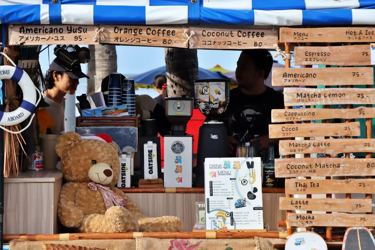 提供的飲品以咖啡為主,項目寫在木板(英、日文)上懸掛在車前,價位70到95銖之間,咖啡很好喝,不太甜。另有泰奶、汽泡飲料等。