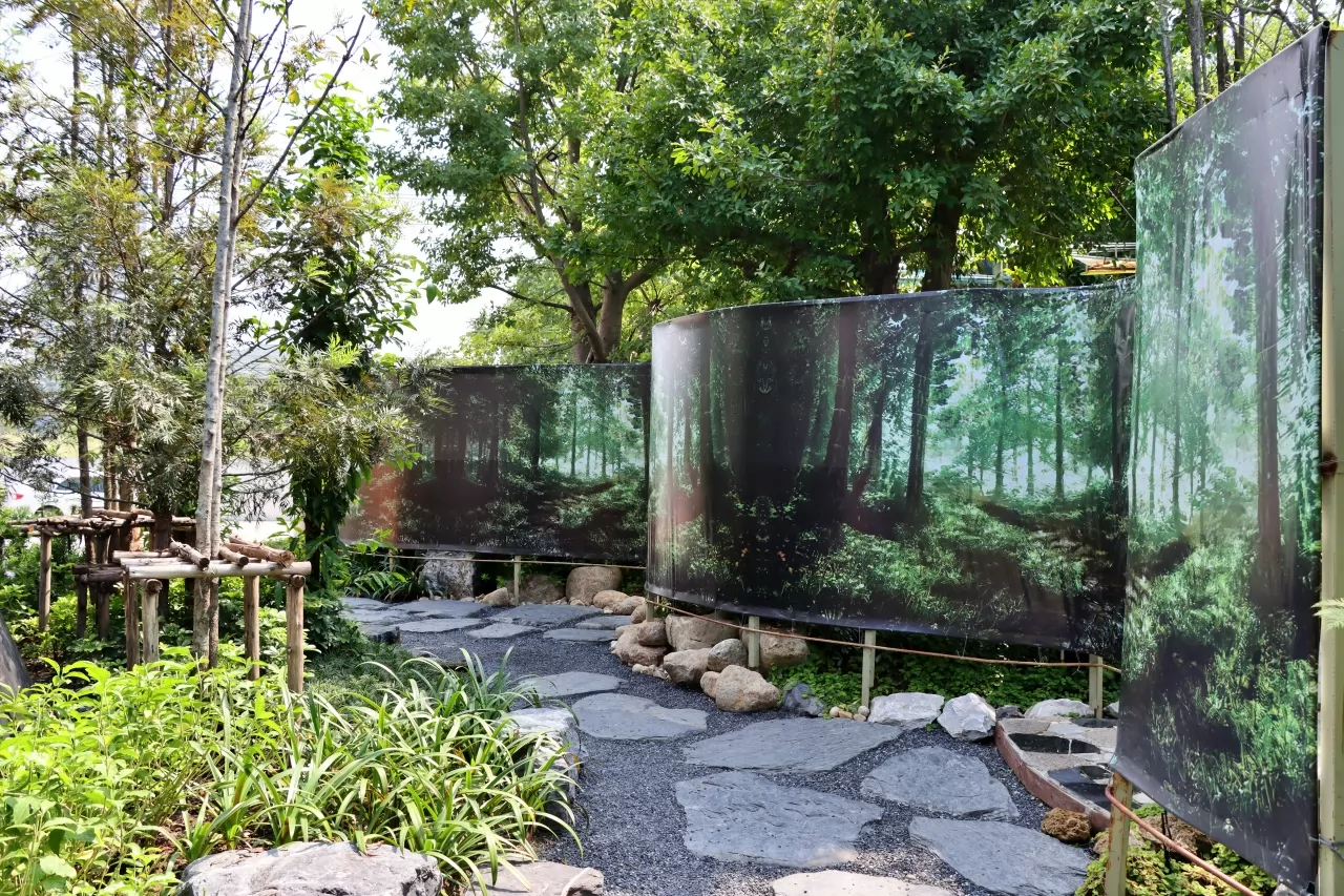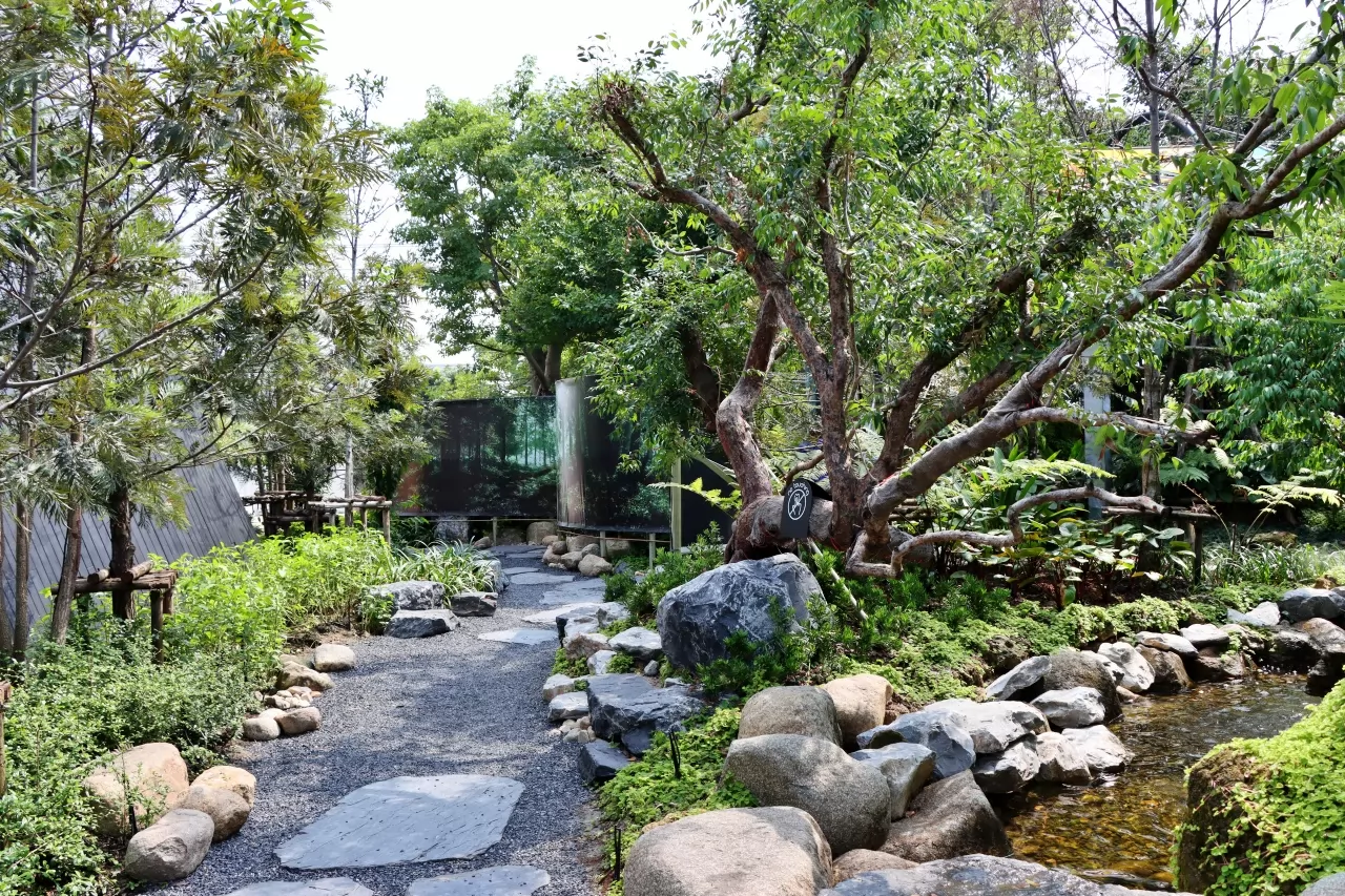 建築物的右邊還有個森林區,綠樹成蔭,人工瀑布和鯉魚,有座椅可以坐下來,親近大自然。
