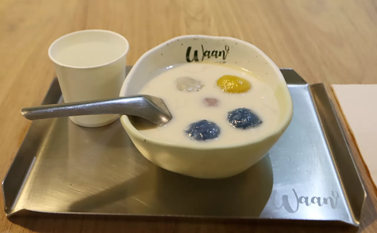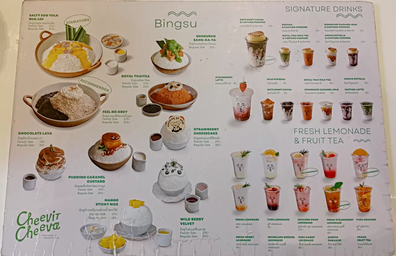 Cheevit Cheeva的招牌必點品項「雪花冰」,一份大概235泰銖,口味包含芒果、糯米、仙草、泰式珍奶、草莓起司蛋糕等,其中更有鹹蛋黃搭配色彩繽紛的泰式湯圓口味,各種融合當地食材的新穎組合,雪花冰非常綿細,牛奶味道香濃且入口即化,一次嚐盡泰國在地的美好滋味。