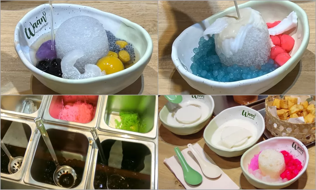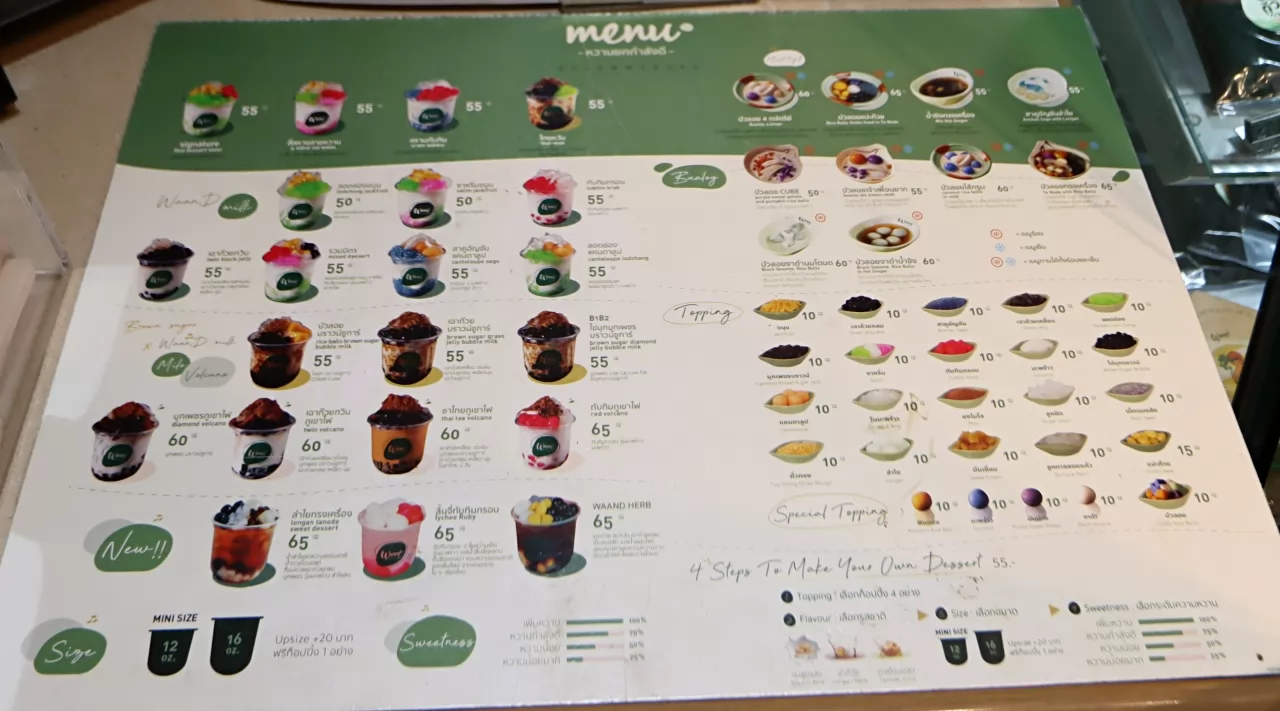 甜品種類超過100樣,價錢由40銖起,燕窩冰非常好吃又便宜,對本地年輕人特別吸引,可以與朋友聊天聚會,又可拍照打卡,自然人客不斷。