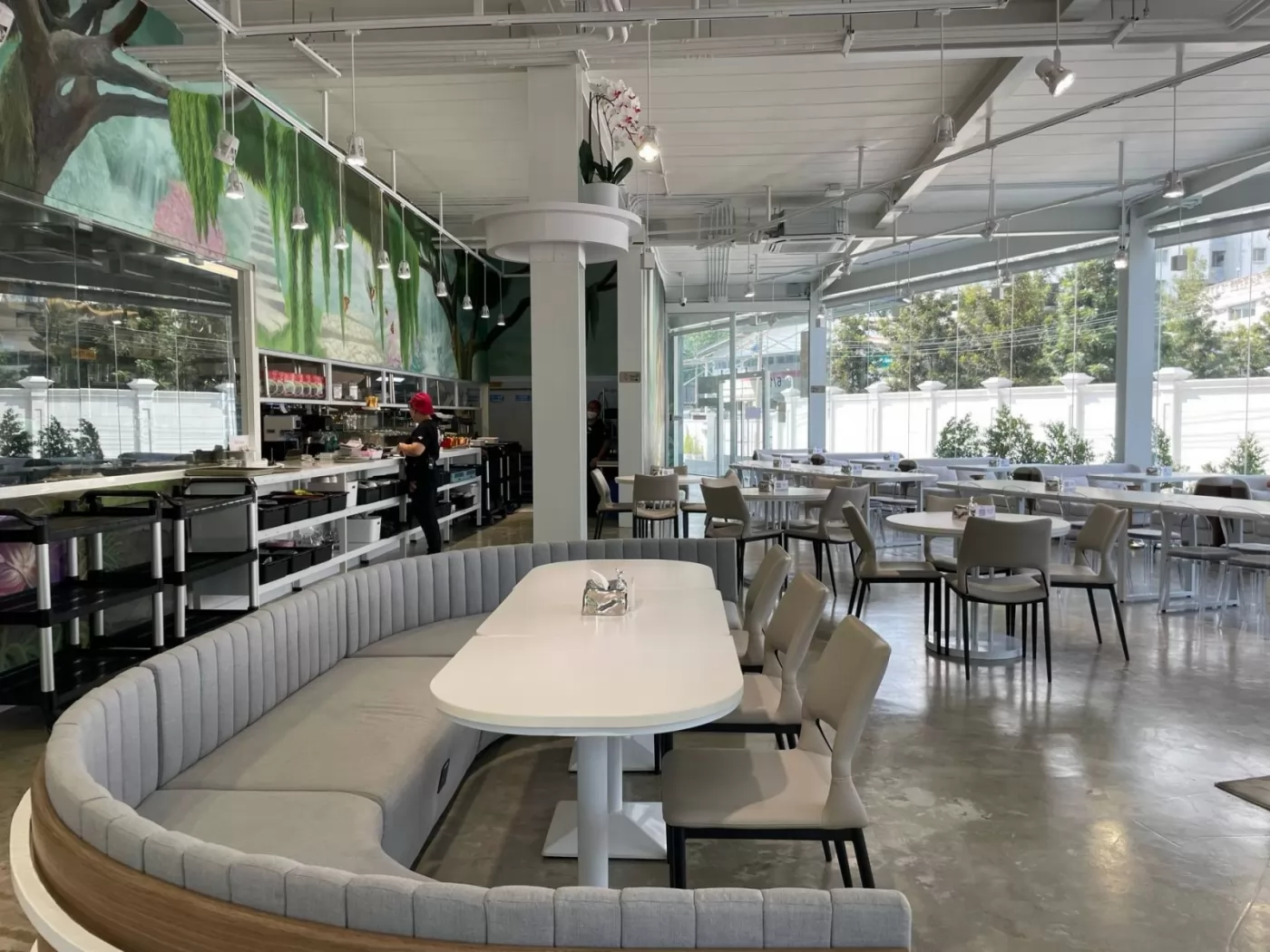 右前兩面啟用落地玻璃牆,沒有遮掩,明亮,打造出一塵不染的用餐環境。