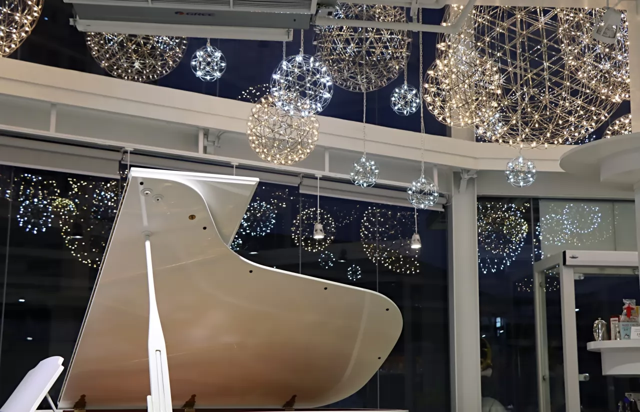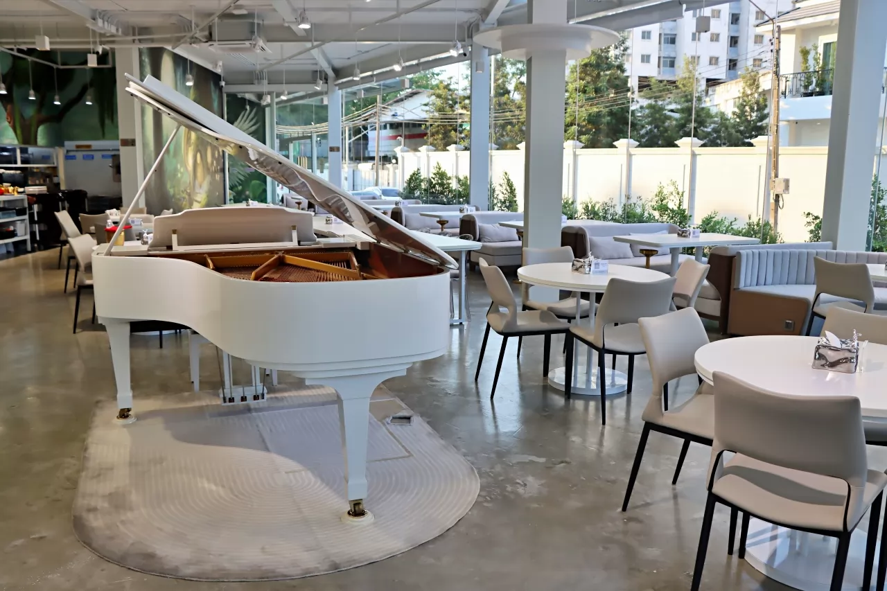 餐廳的佈置上,以白色鋼琴為中心,四周圍繞著以音符和鍵盤式排列的桌椅。