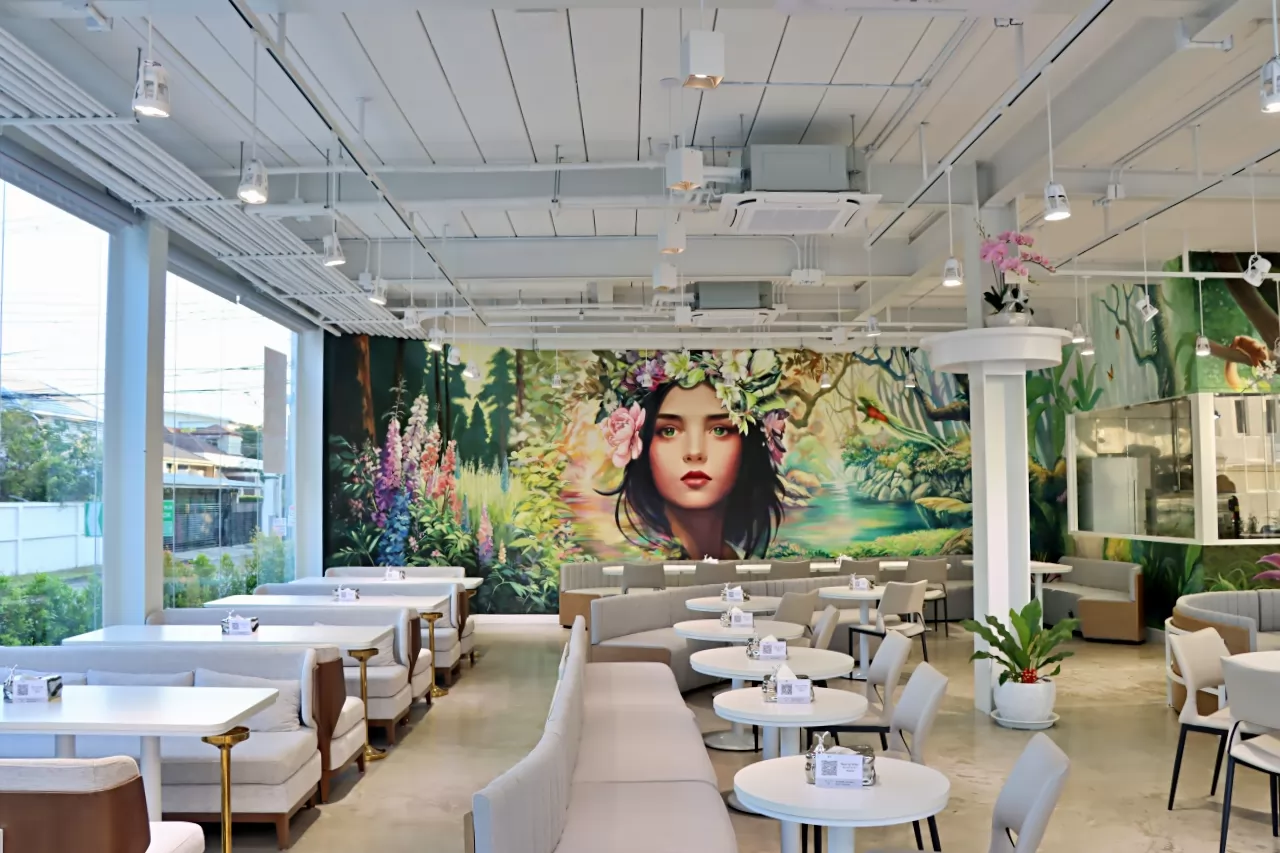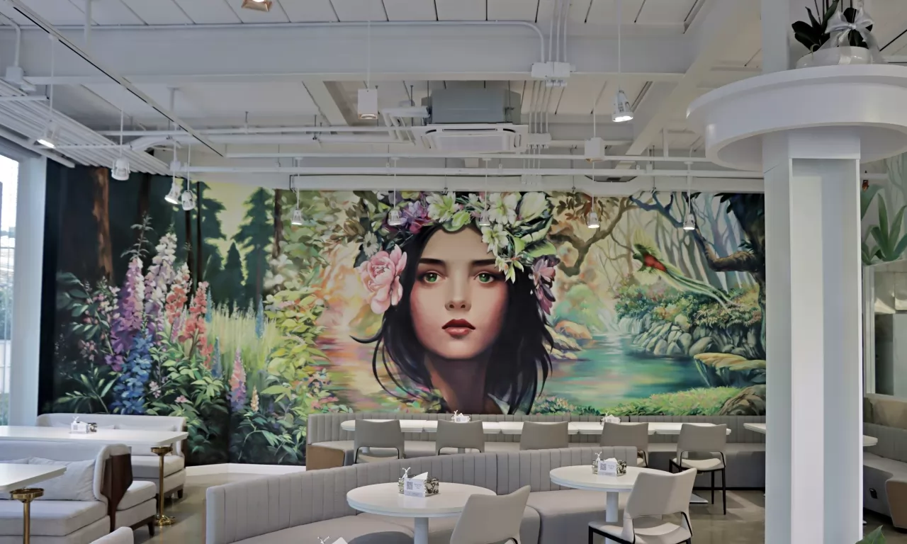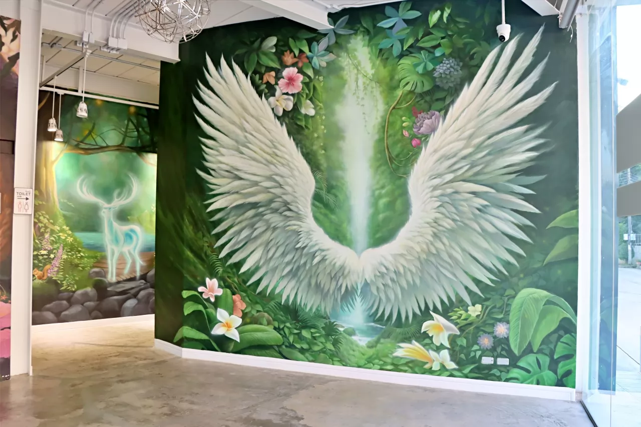 旗艦店至少有以下5點特色,首先就設計來說,最吸晴的當屬橫貫牆壁的壁畫—講述的是美麗少女進叢林探險的歷程,從餐廳延伸到外面的洗手間,最終白色展翼的翅膀,留給客人打卡拍照。