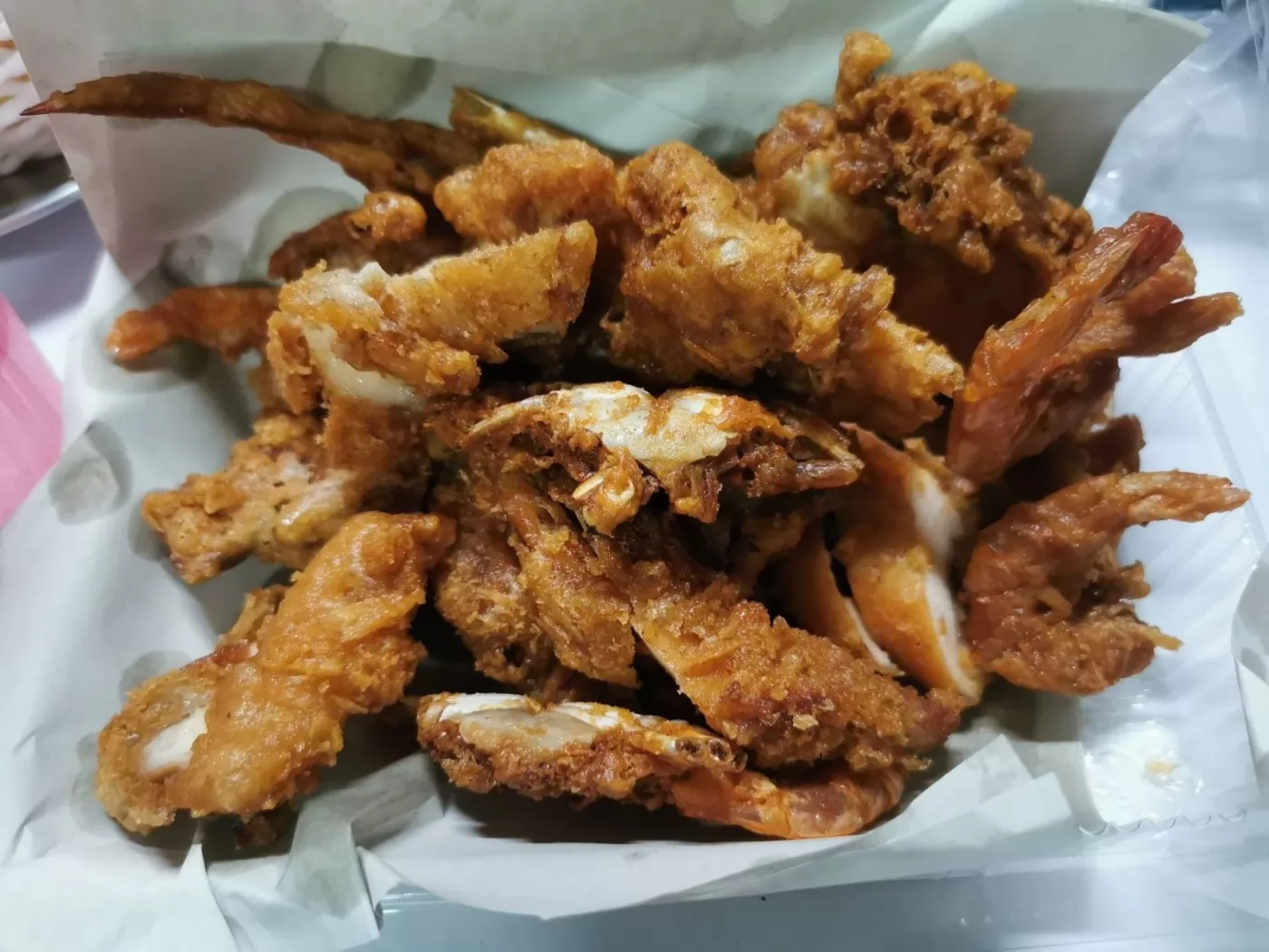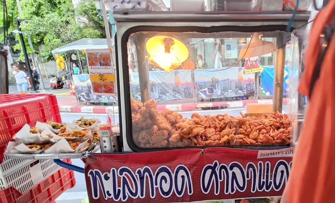 在SalaDaeng巷口,有個油炸小海鮮攤(ทะเลทอด),專賣香脆的炸蟹、蝦及魷魚的攤子,從下午3點半賣到晚上10點,把小蝦、小螃蟹和切塊的魷魚,加麵粉油炸出來,讓一些過路人的目光隨香味掃來,忍不住停下腳步,買來嚐鮮!